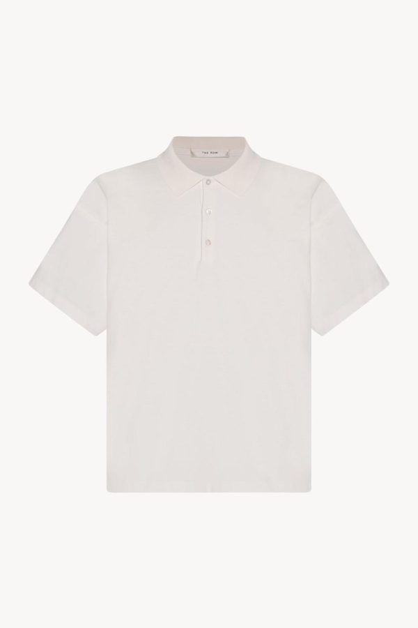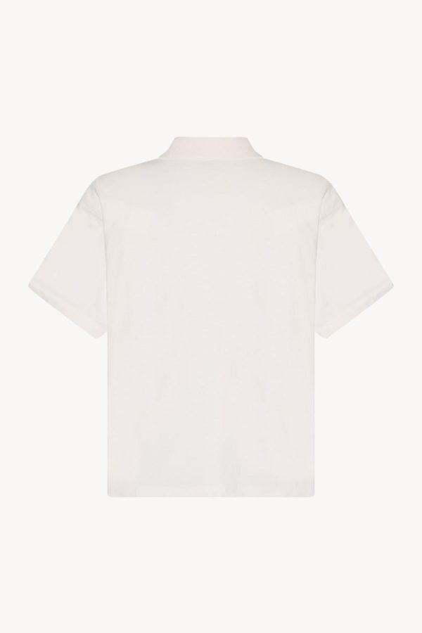 Short-sleeved polo top in midweight cotton jersey with boxy fit, ribbed collar, and exposed front button placket.