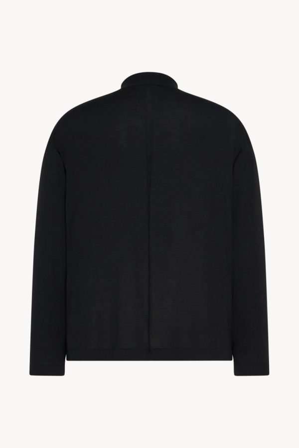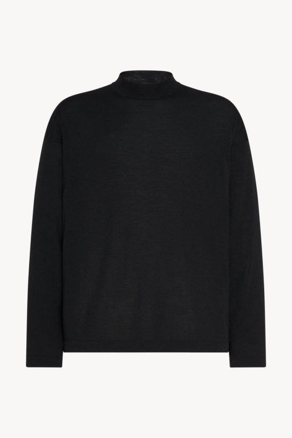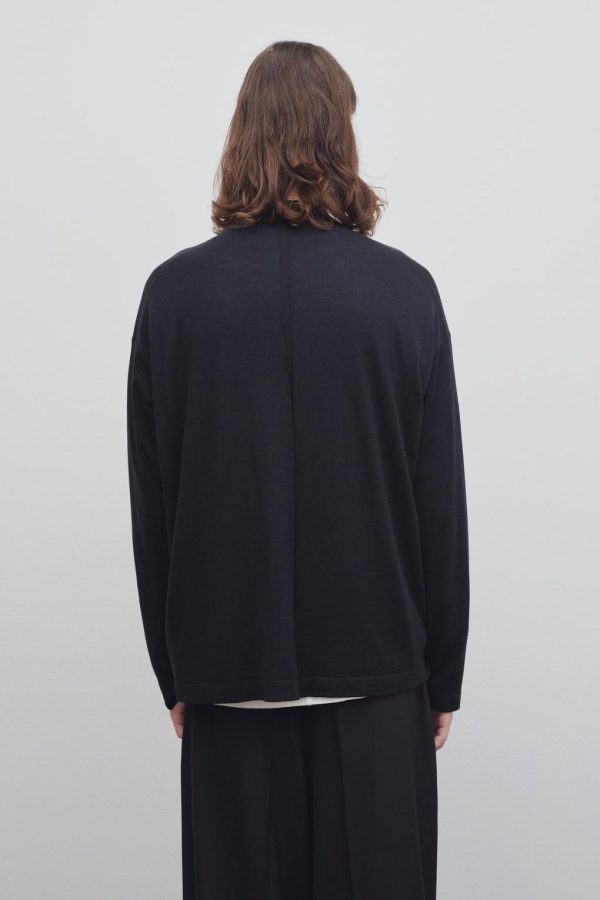 Long-sleeved mock neck top in extra fine wool with boxy fit, ribbed collar, and signature center back detail.