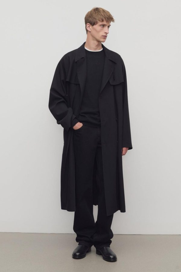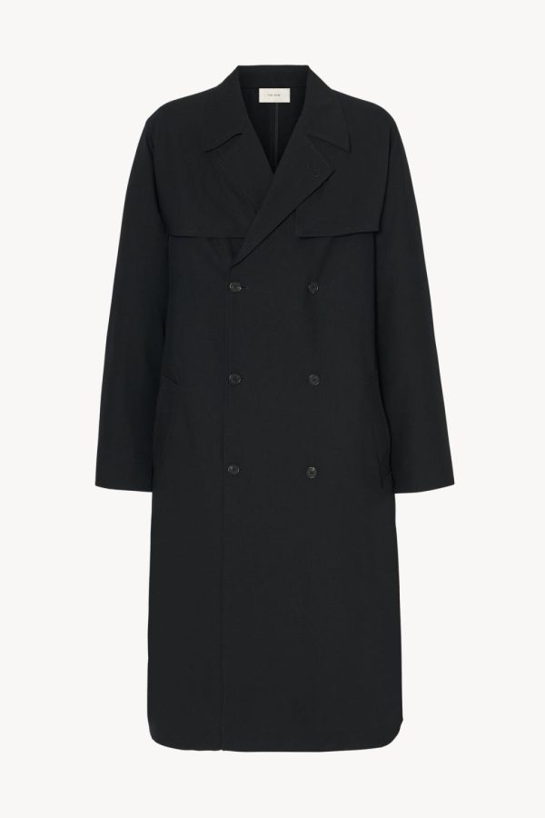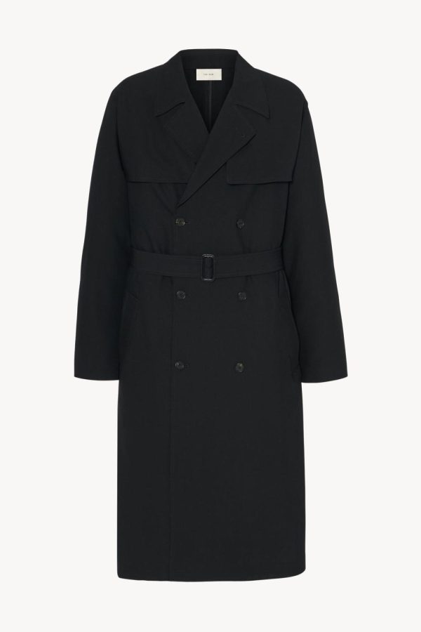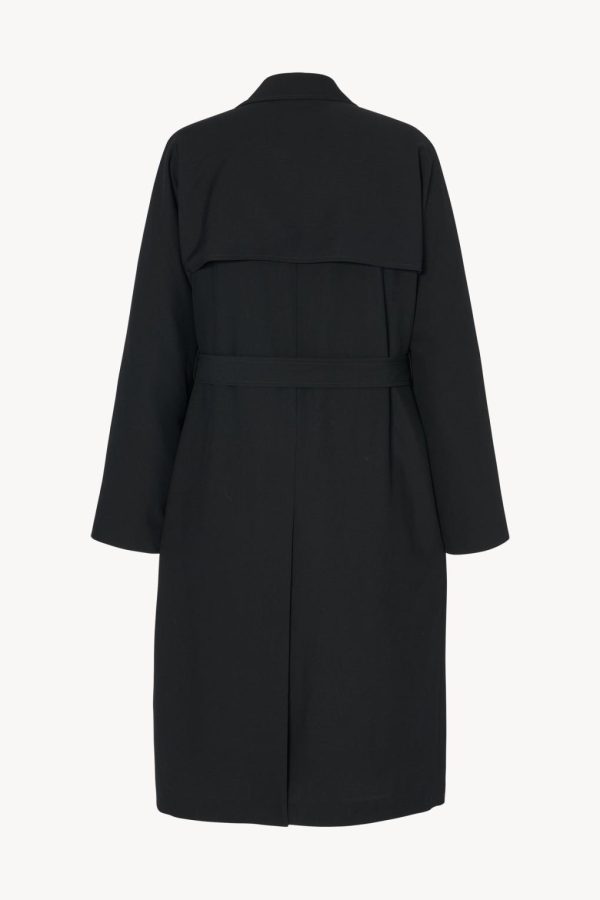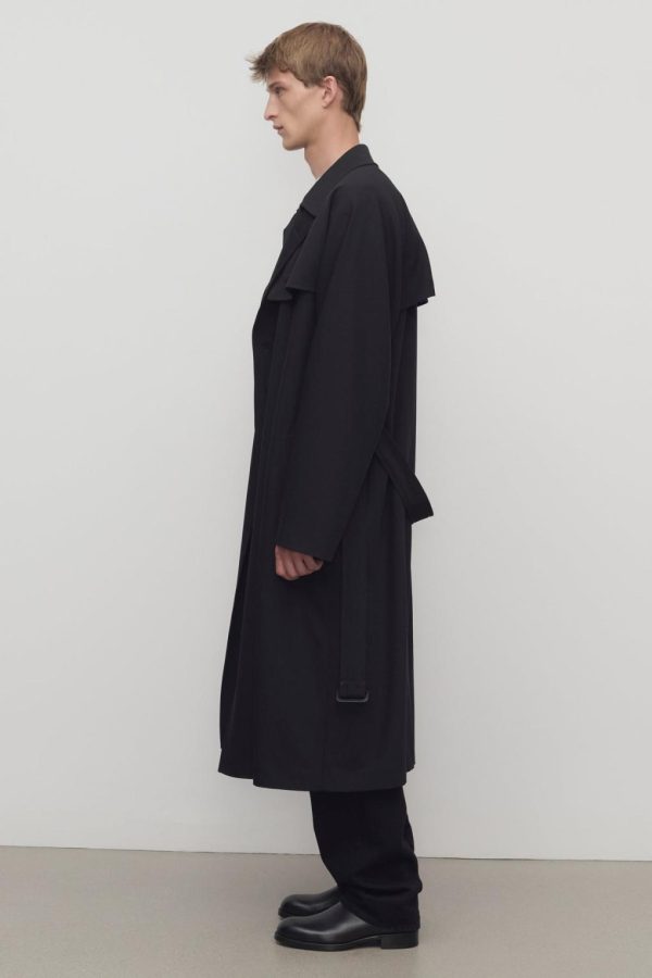 Double-breasted trench coat in smooth virgin wool gabardine with front and back storm flaps, removable buckle belt, and front button closure.
