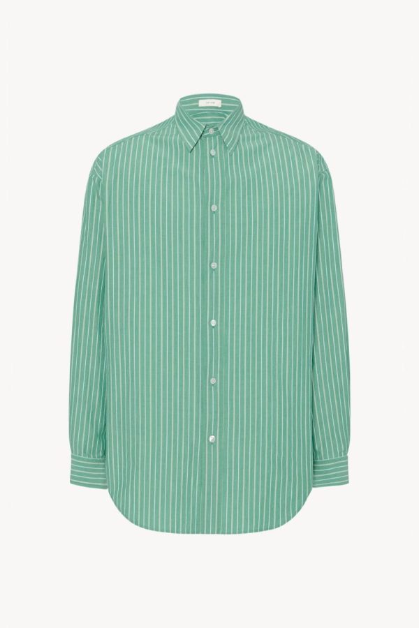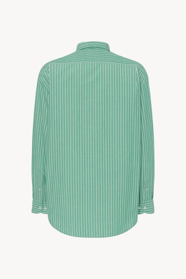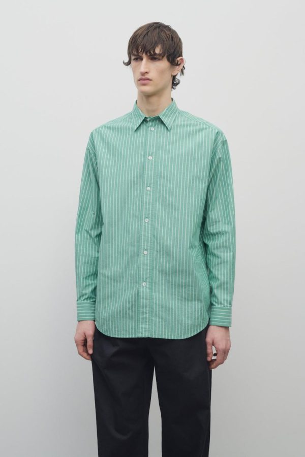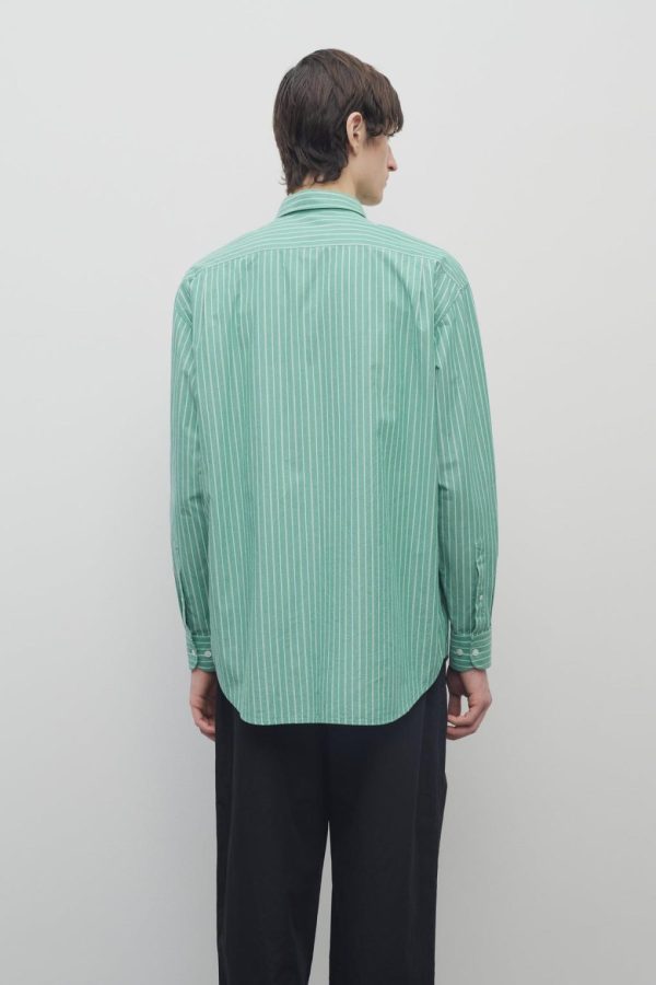 Classic button-up shirt in washed Japanese cotton with slim back yoke, curved hem, and exposed front placket with mother-of-pearl buttons.