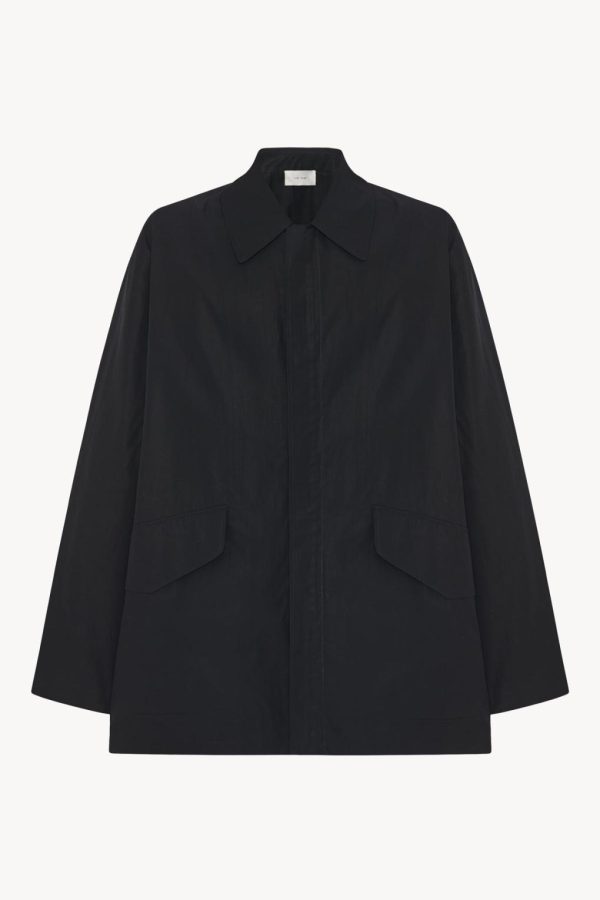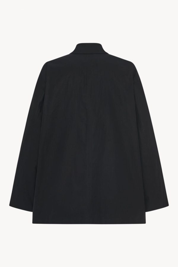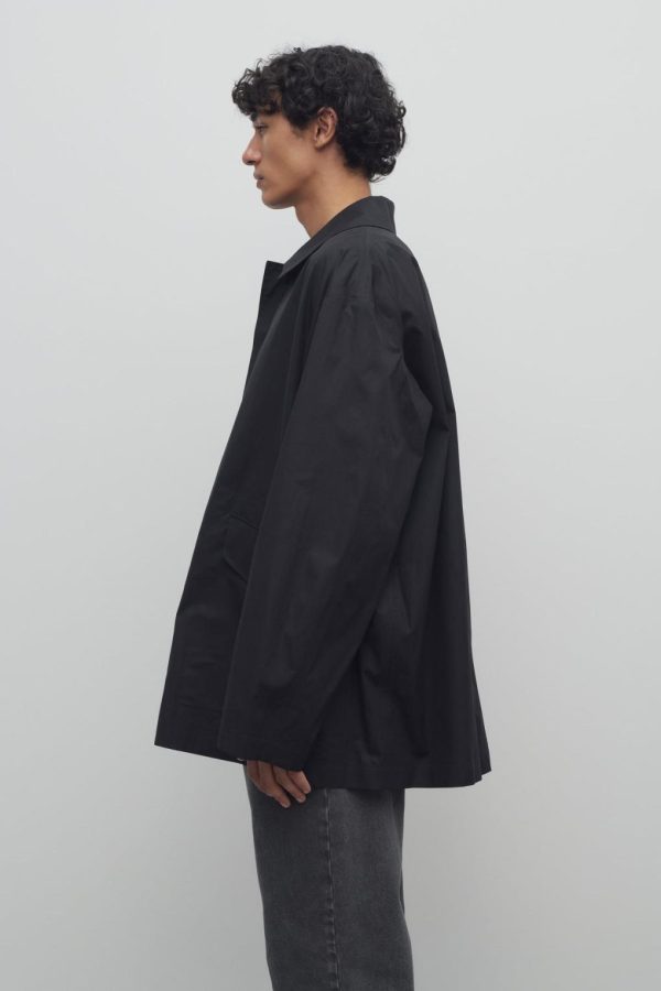 Boxy work jacket in Pima cotton poplin with slanted front flap pockets and concealed front placket with two-way zipper closure.