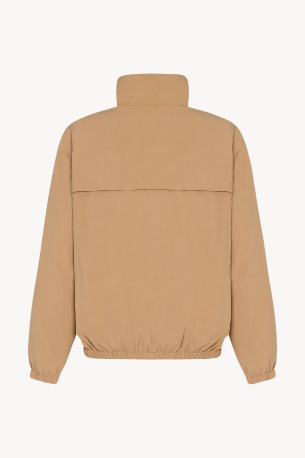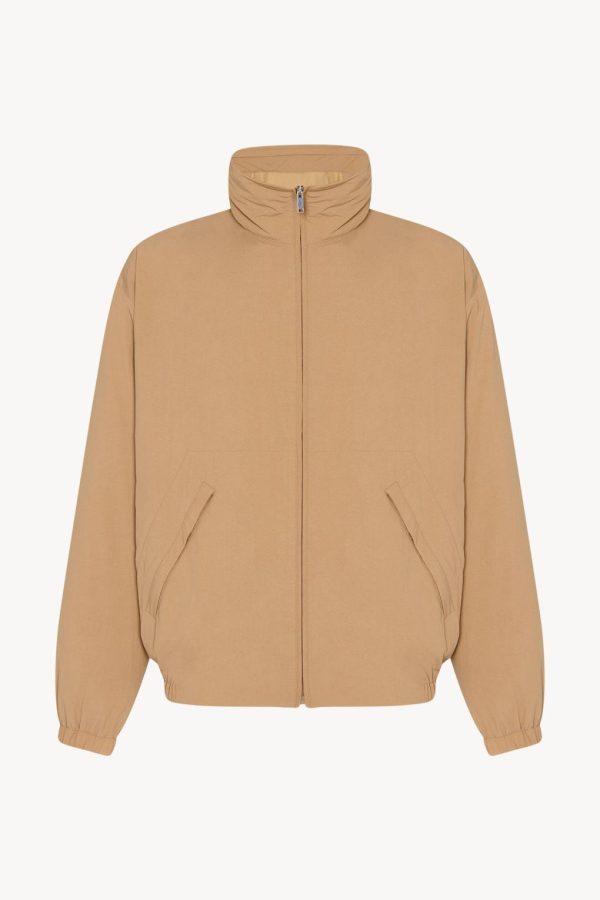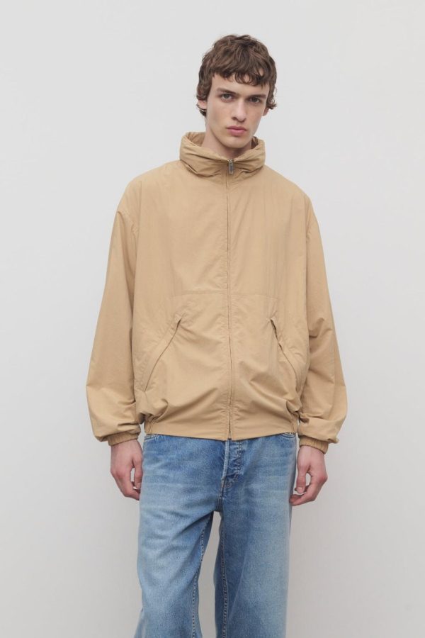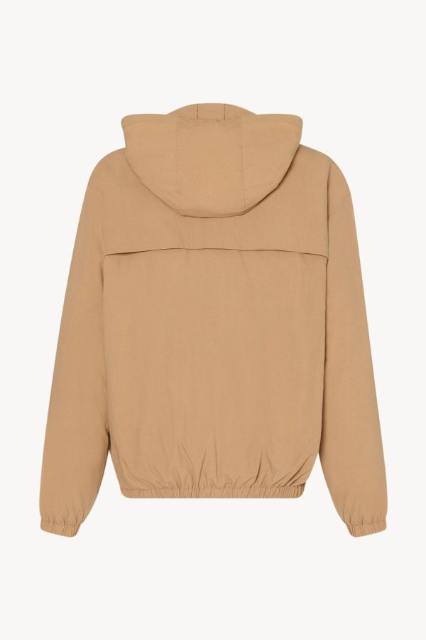 Lightweight bomber jacket in technical nylon with concealable hood at collar, back storm flap, and front zip closure.