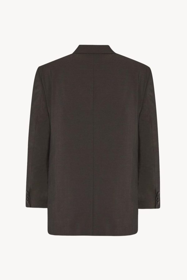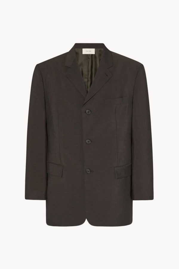 Single-breasted tailored jacket in lightweight virgin wool and mohair with notch lapel, front flap pockets, and front button closure.