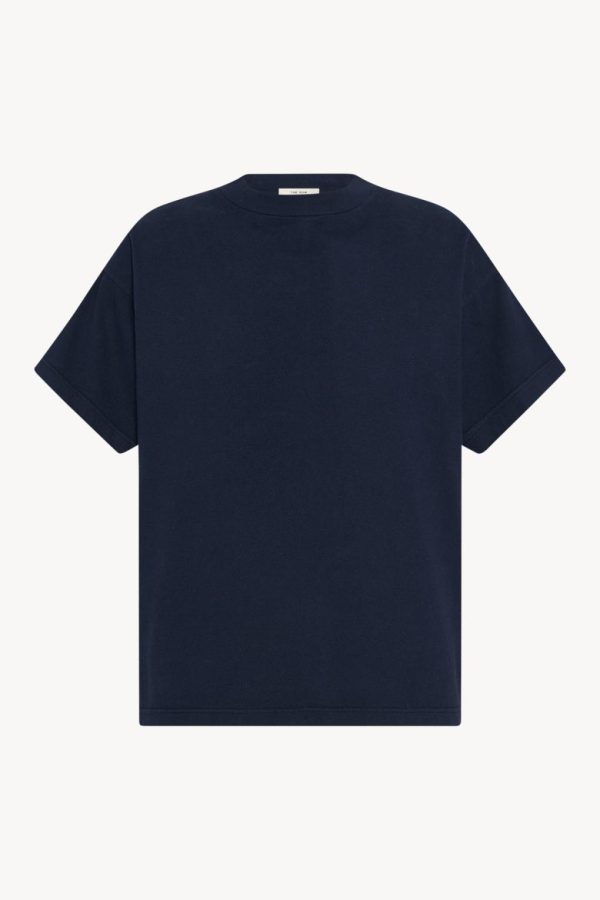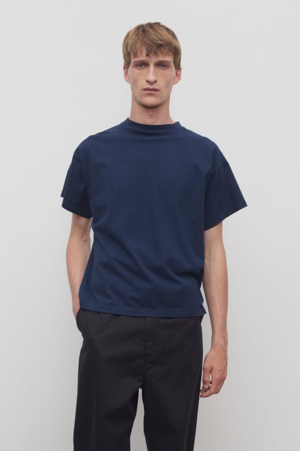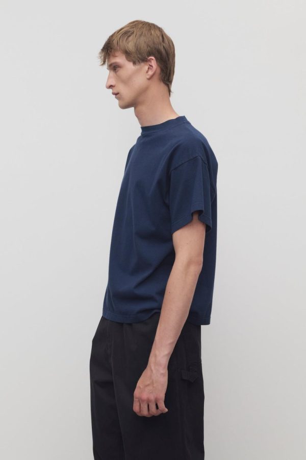 Boxy short-sleeved t-shirt in midweight cotton jersey with ribbed, rounded neckline and signature center back detail.