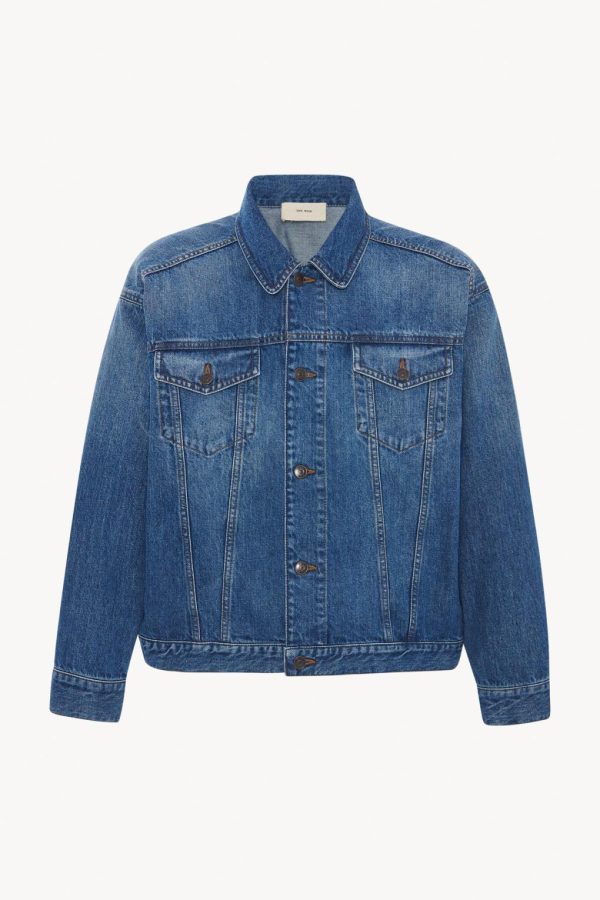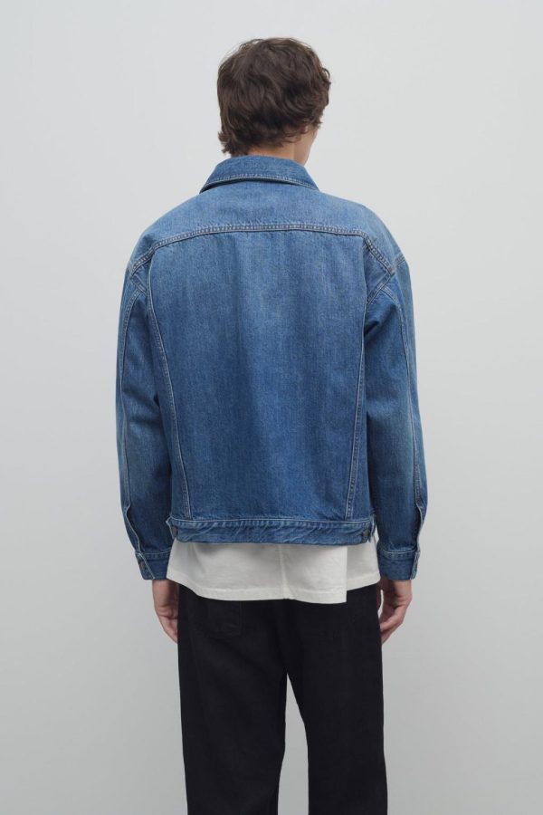 Classic denim jacket in garment treated denim with two front patch pockets, angled front seams, and front button placket.