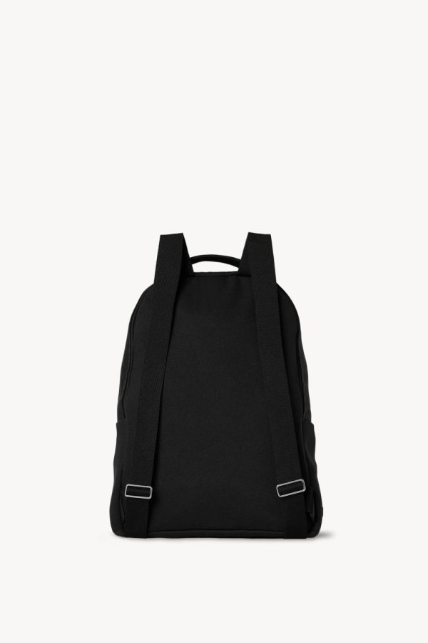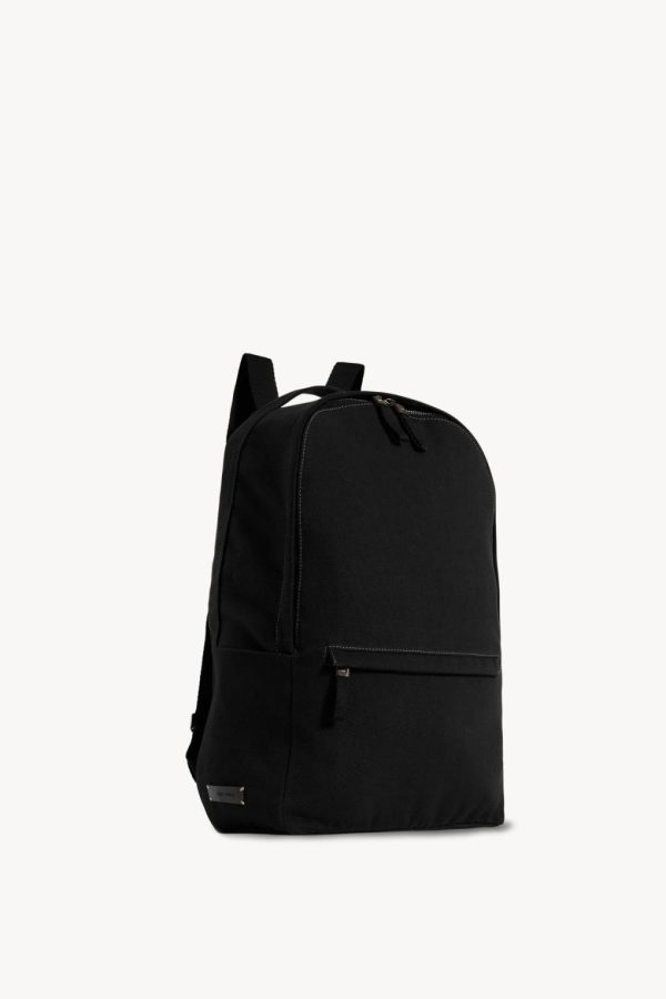Minimal backpack in textured cotton twill with adjustable woven straps, contrast topstitching, and dual-zip closure.
