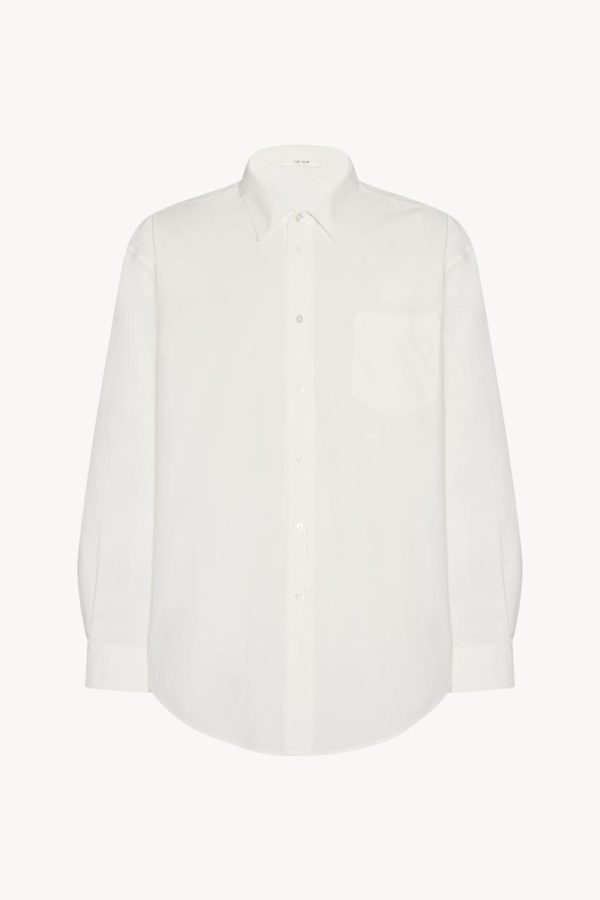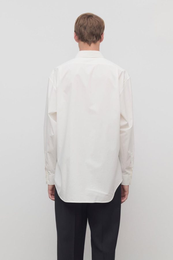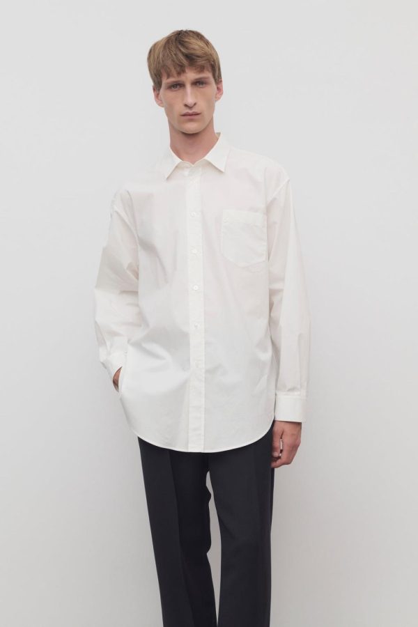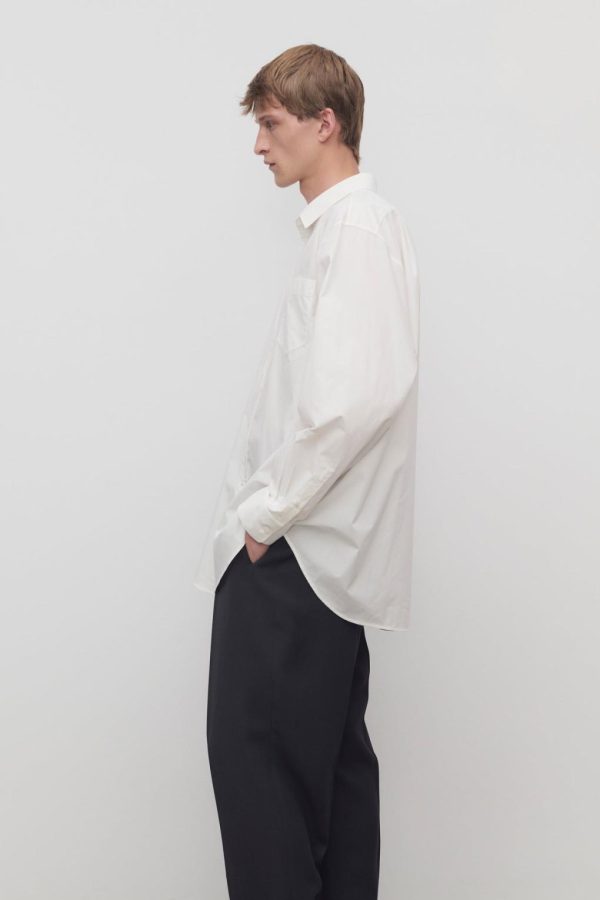 Relaxed button-up shirt in sanded cotton poplin with curved hem, front patch pocket, and exposed front placket with button closure.