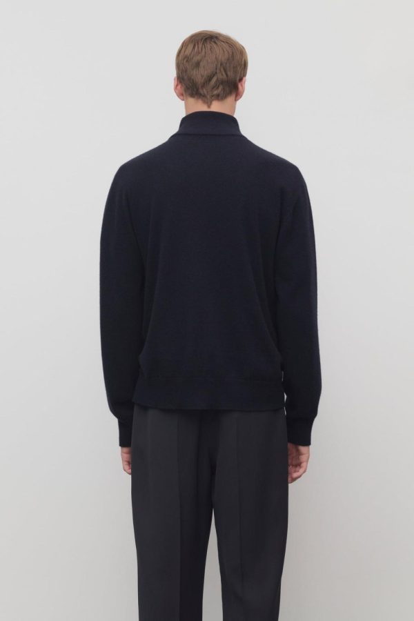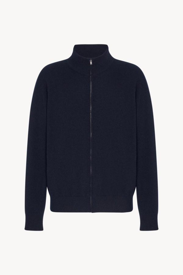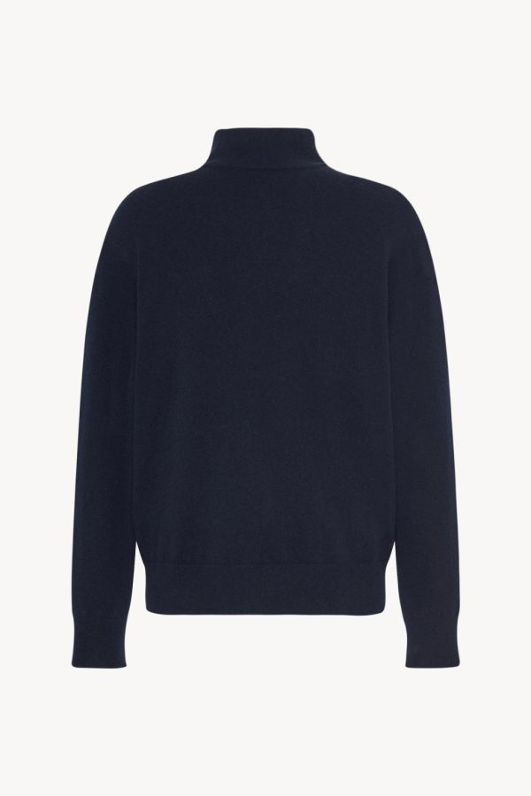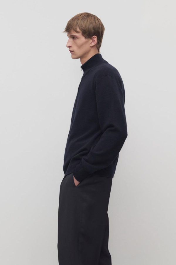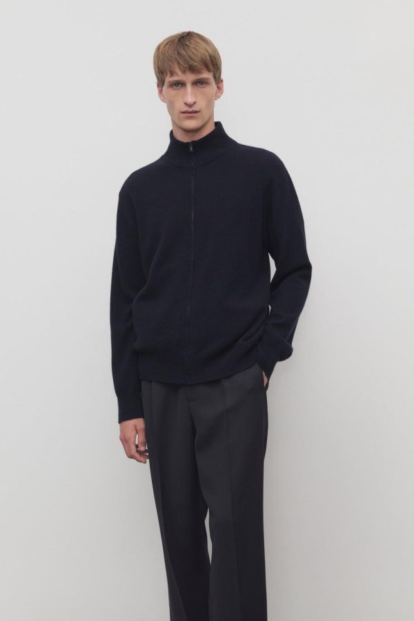 Long-sleeved sweater in soft cashmere with relaxed fit, ribbed neckline, cuffs, and hem, and front zipper closure.