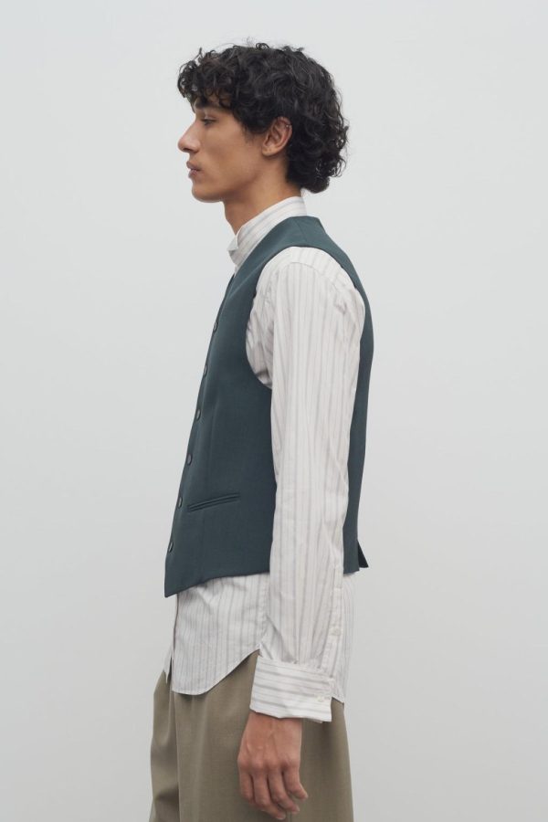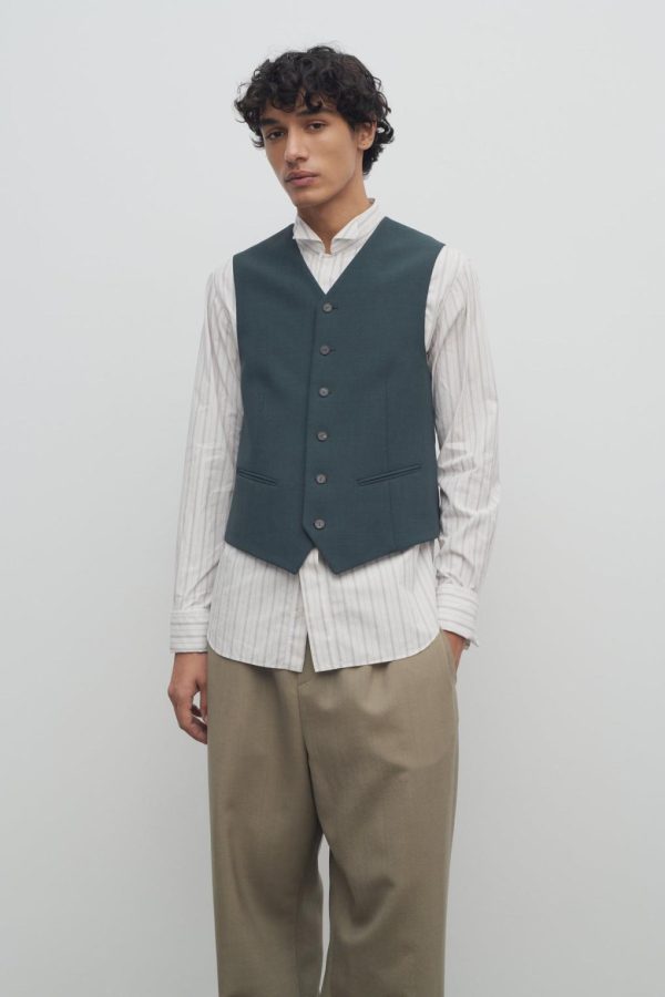 Single-breasted tailored vest in virgin wool gabardine with front besom pockets, center back vent, and horn button closure.