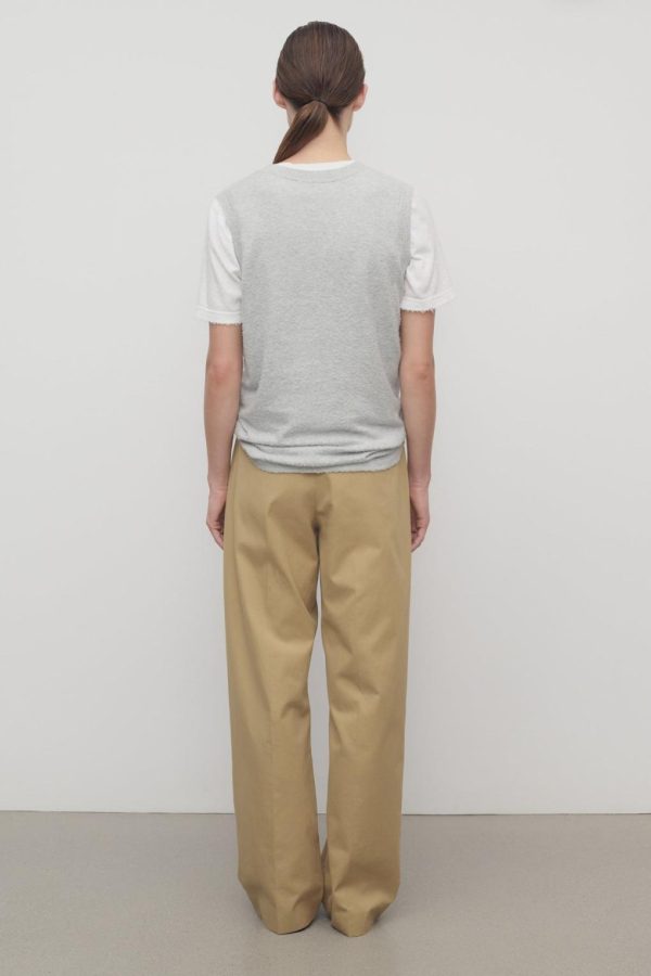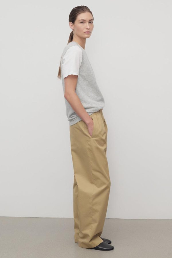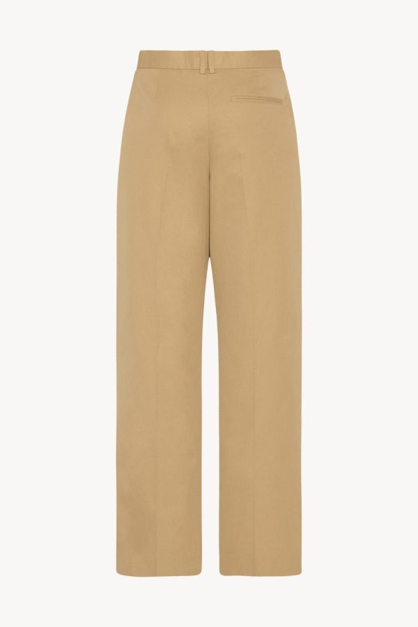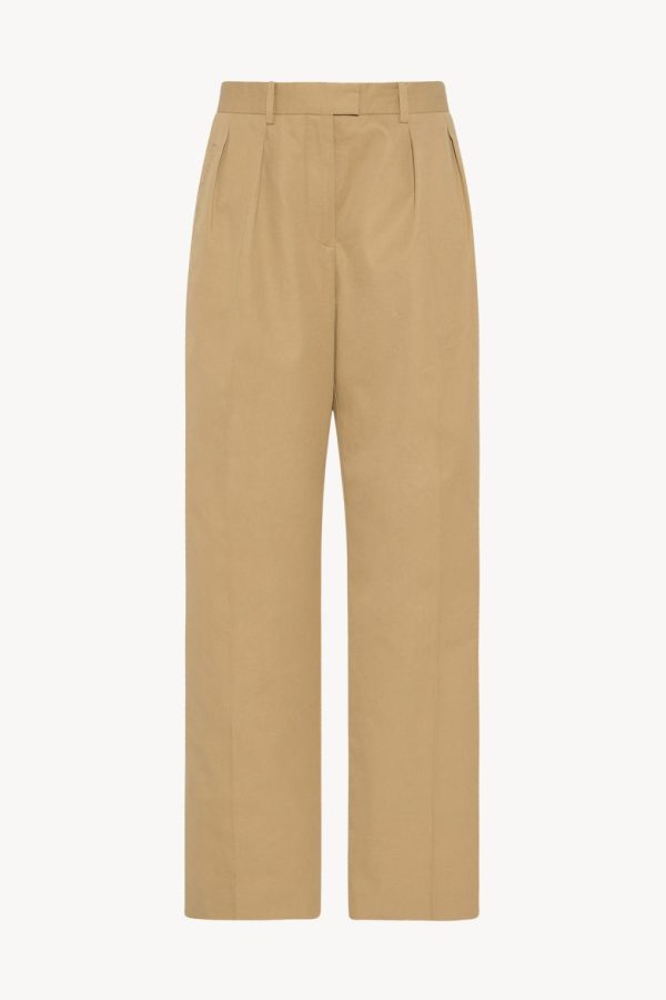 Low-rise tailored trouser in soft cotton and cashmere gabardine with straight leg, front double pleats, and side welt pockets.