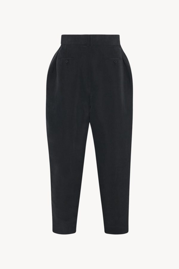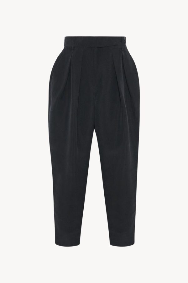 Low-rise trouser in natural silk shantung with tapered leg, triple front pleats, and side slash pockets.
