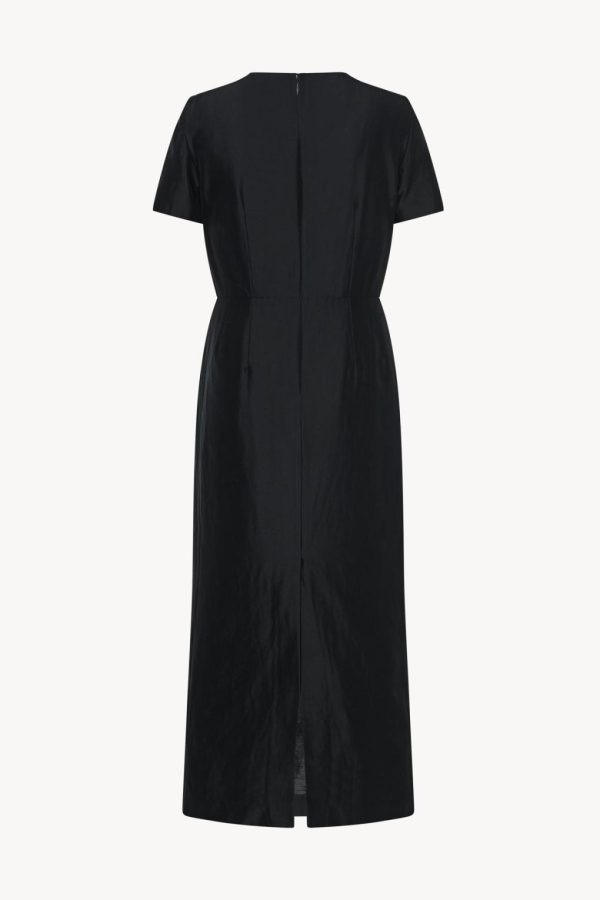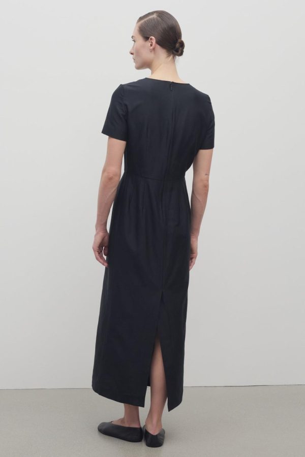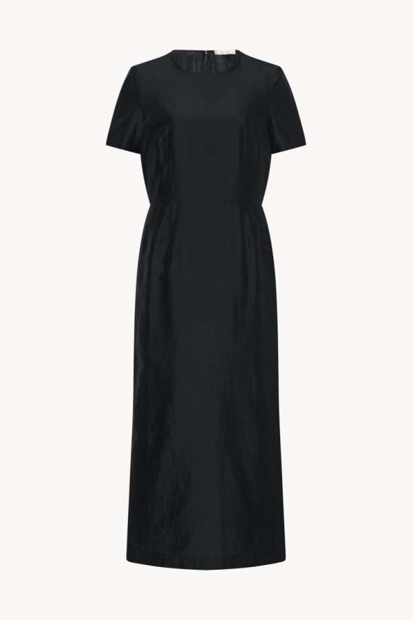 Ankle-length shift dress in woven cotton and silk voile with rounded neckline and fitted waist.