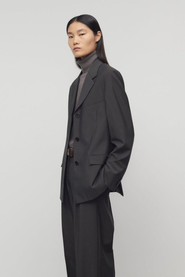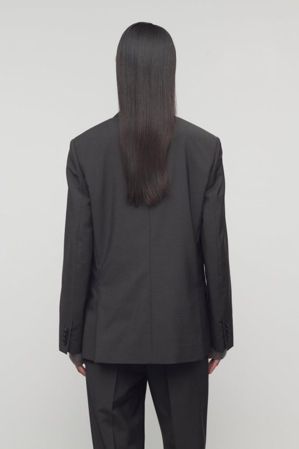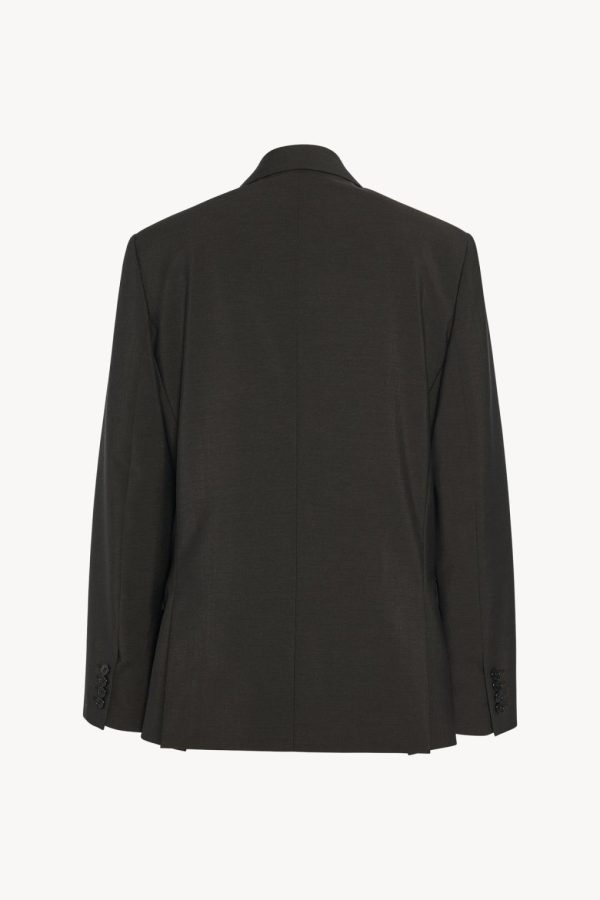 Structured single-breasted jacket in lightweight virgin wool and mohair with notch lapel, front flap pockets, and horn button closure.