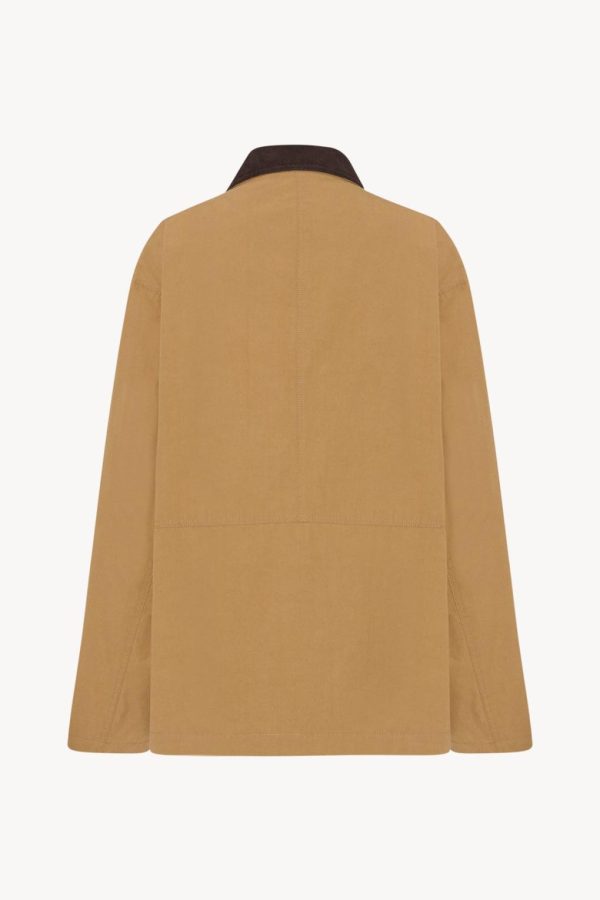Outdoor jacket in enzyme-washed cotton with contrast corduroy collar, front patch pockets, and concealed front placket with snap and zipper closure.