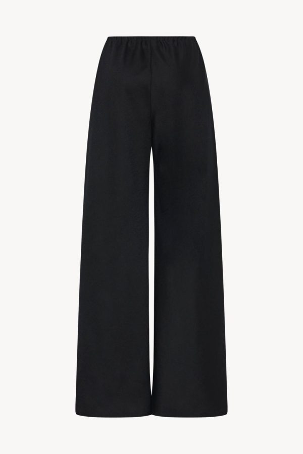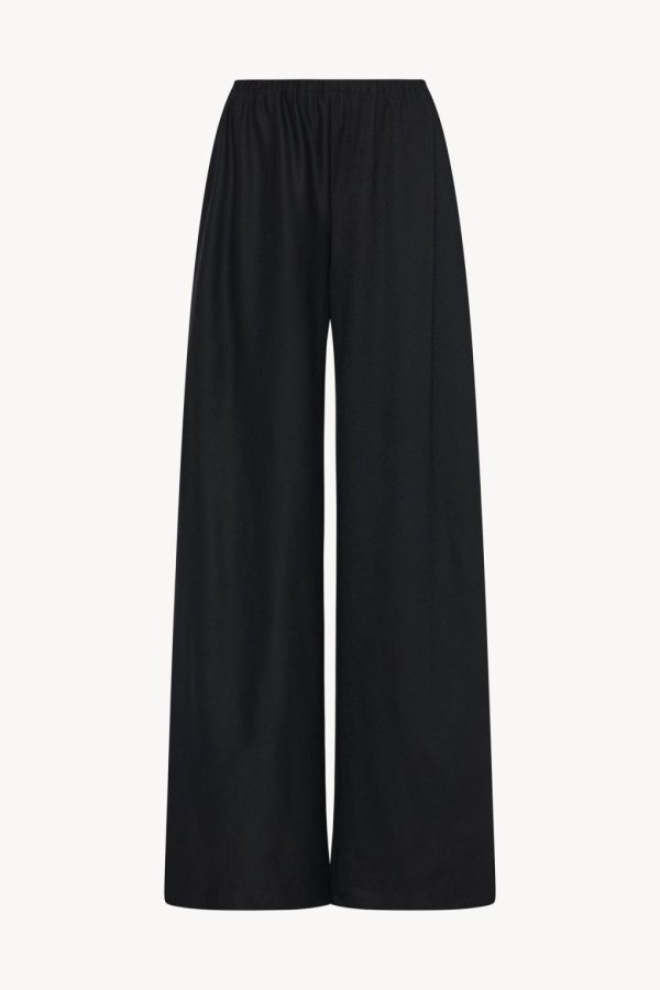 Bias-cut pant in soft virgin wool flannel with slim gathered elastic waistband and fluid wide leg.