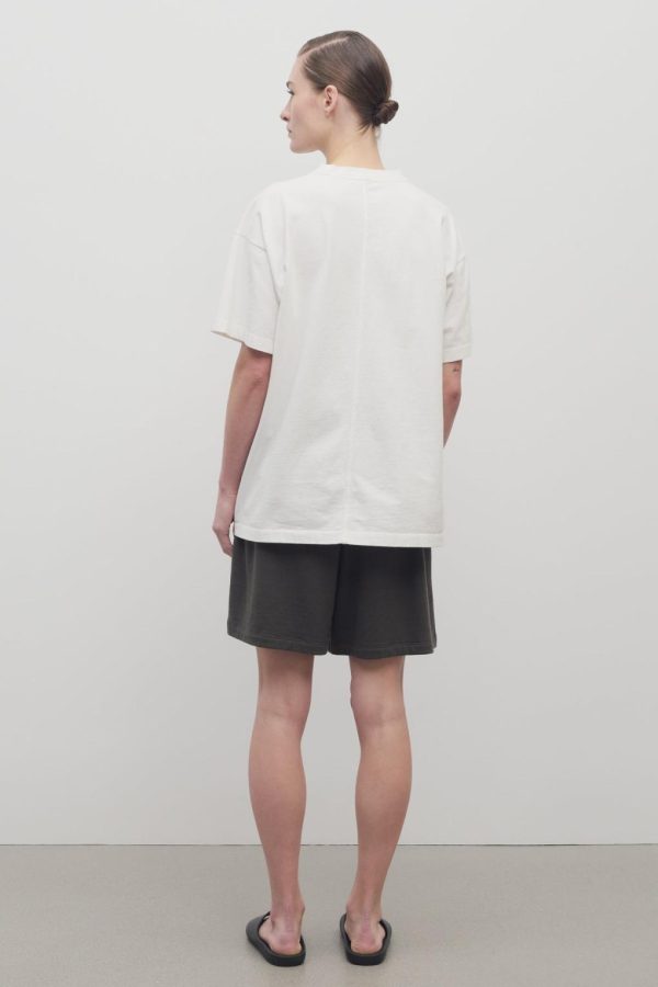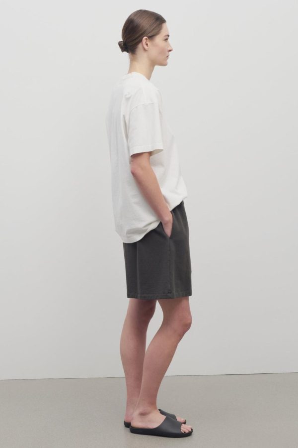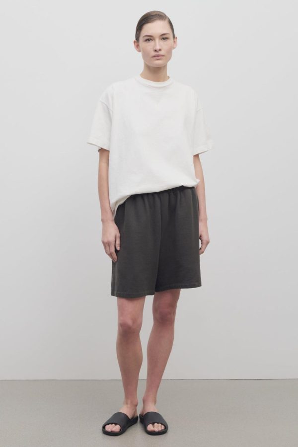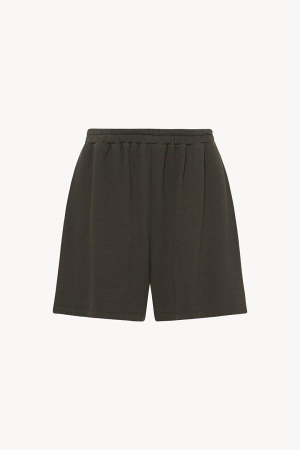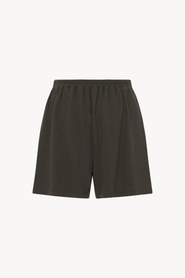 Relaxed mid-rise short in cotton and cashmere French terry with gathered elastic waistband and side-seam pockets.