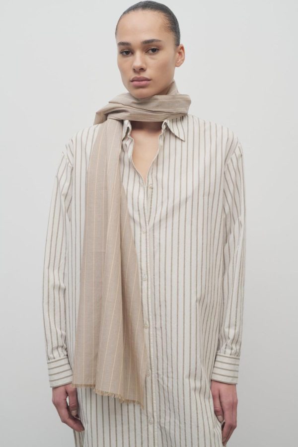 Woven scarf in lightweight striped cotton with raw edge finish.