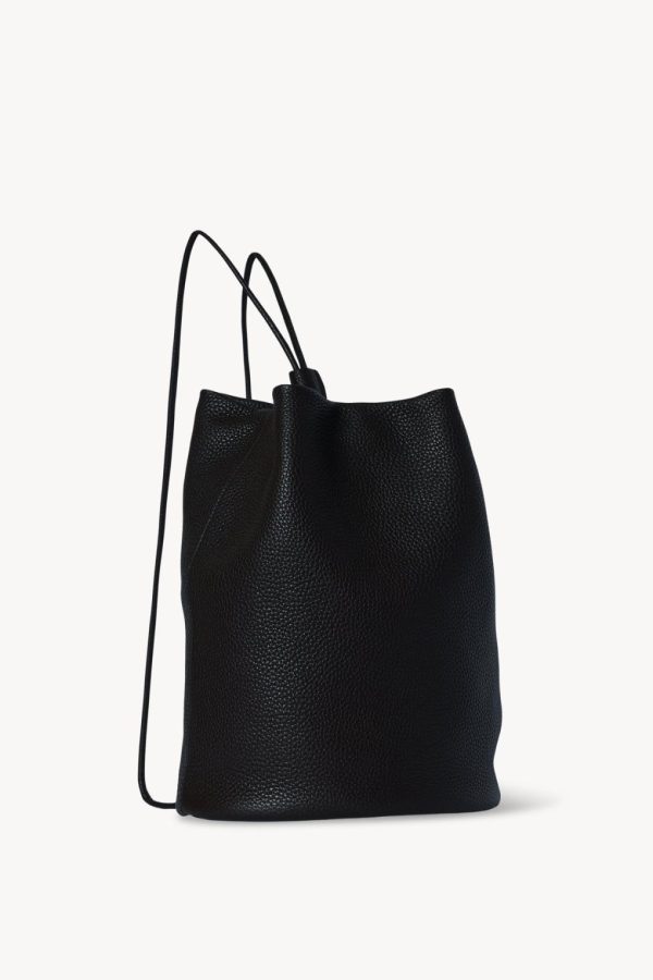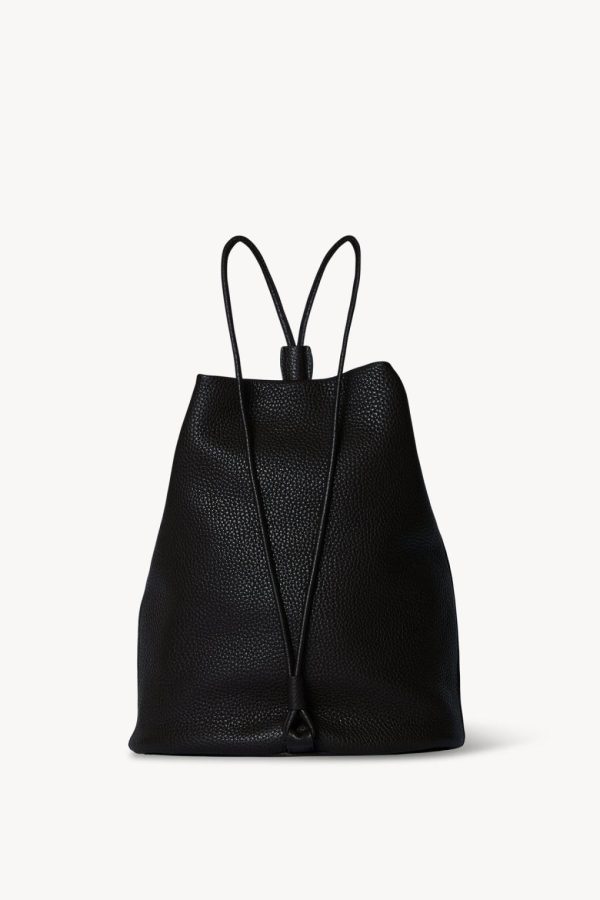 Minimal backpack in pebbled calfskin leather with drawstring closure and hand-crafted shoulder straps.