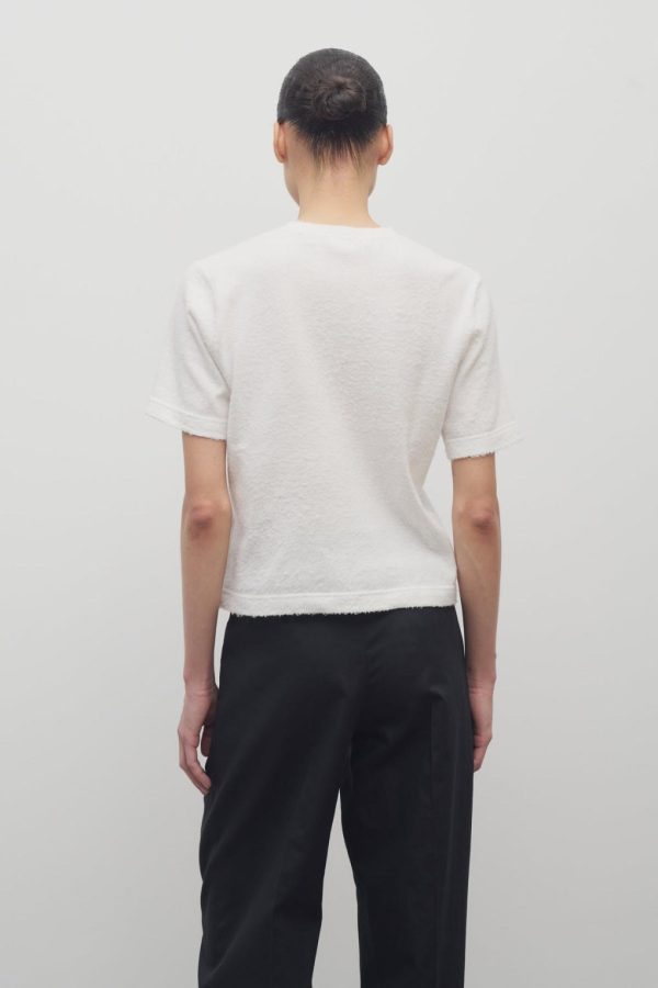 Italian artisanal brushing techniques typically reserved for cashmere have been applied to the surface of the organic cotton. The brushing technique gently releases the cotton fibers, creating a uniquely fluffy, pilled and soft surface that would usually be associated with cashmere. The underside is unbrushed and remains in the smooth fresh cotton. To maintain the fine texture of the fabric this garment should be dry cleaned.