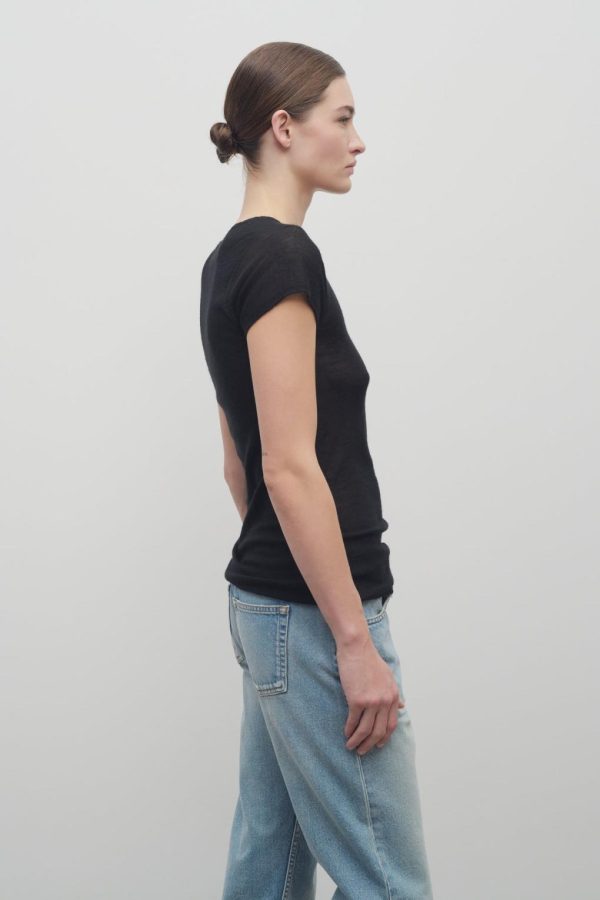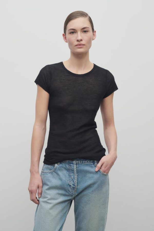 Relaxed t-shirt in ultrafine textured cashmere with rounded neckline, cap sleeves, and slim fit.