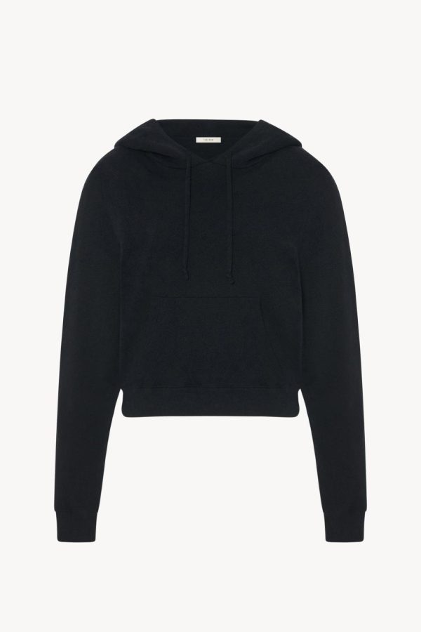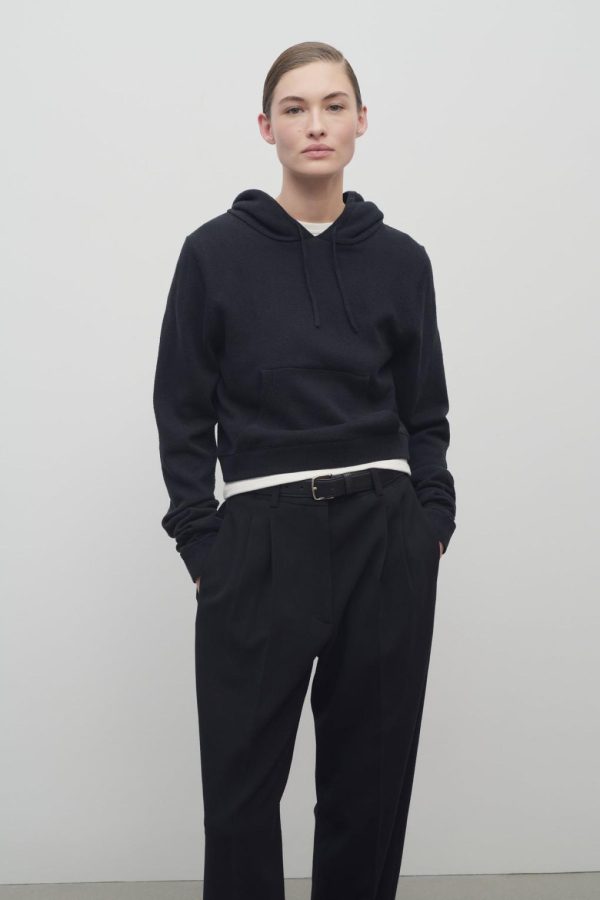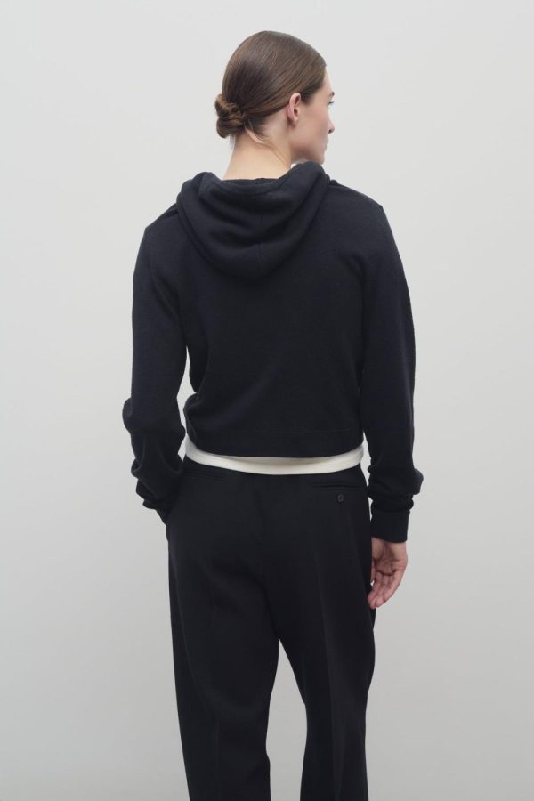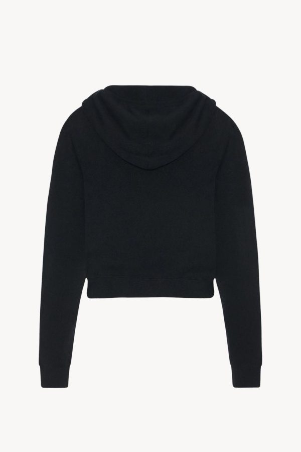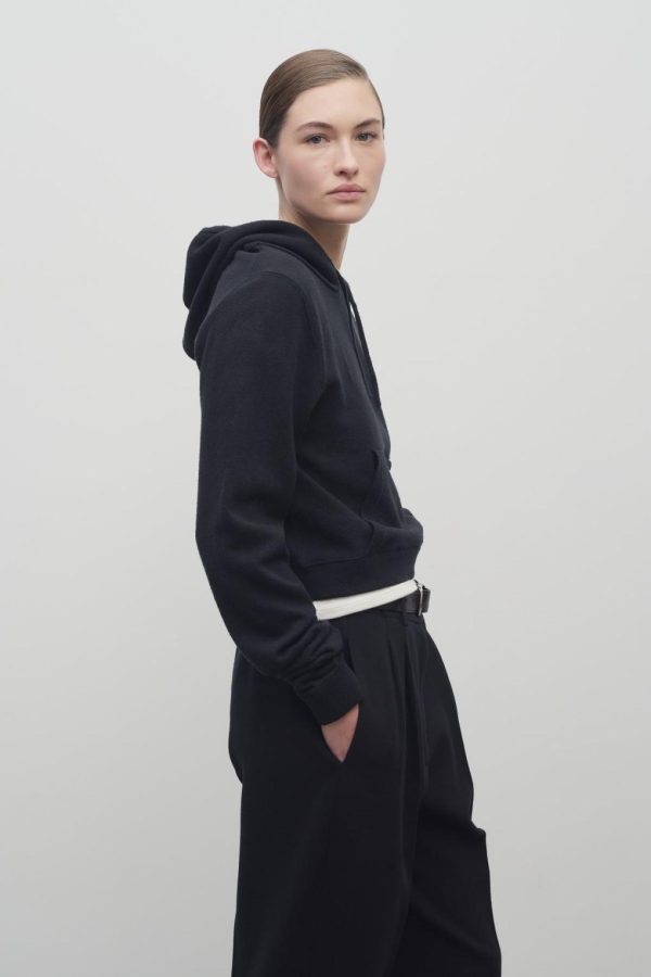 Cropped hooded sweatshirt in stonewashed silk jersey with front pouch pocket, and ribbed cuffs and hem.