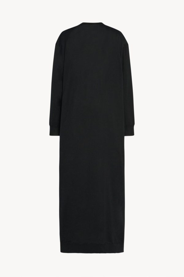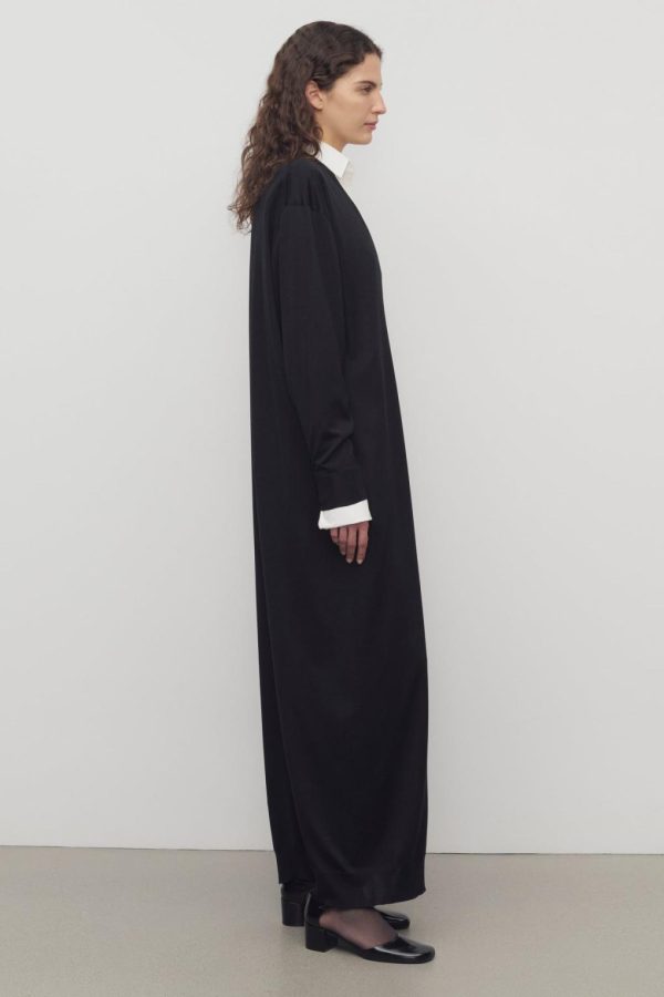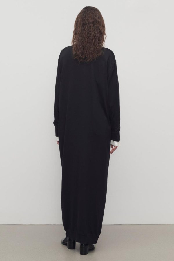 Ankle-length long-sleeved dress in finely knit silk with relaxed silhouette, deep v-neck, and ribbed neckline, cuffs, and hem.