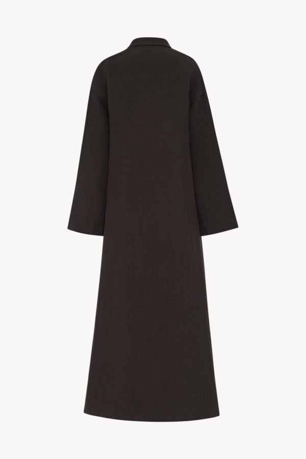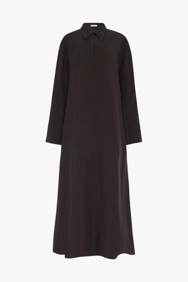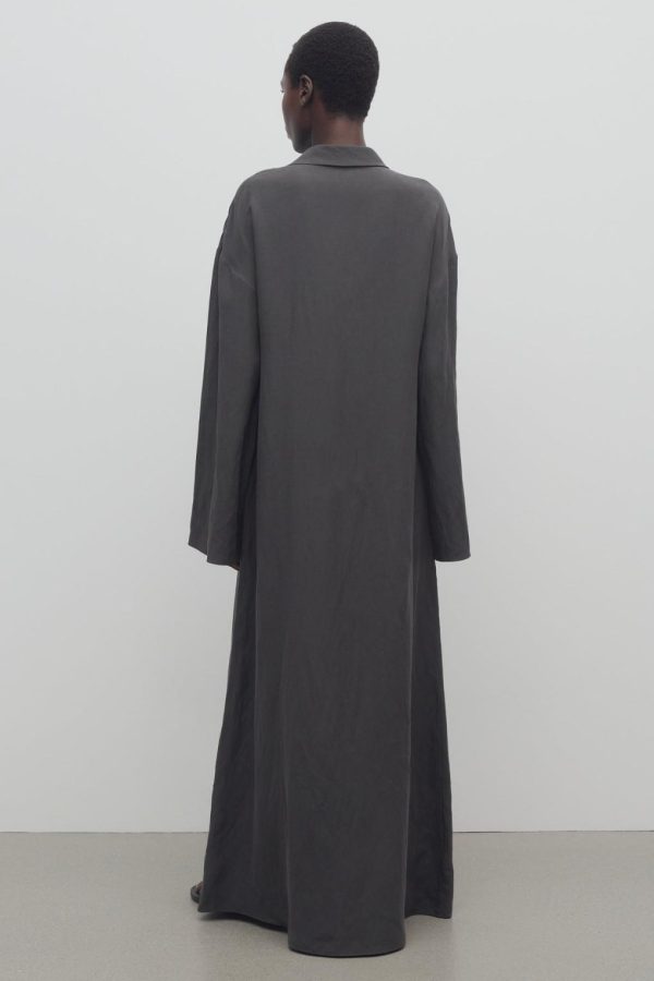 Floor-length tunic dress in woven silk and linen with dropped shoulders, side seam pockets, and folded neckline with hidden hook closure.