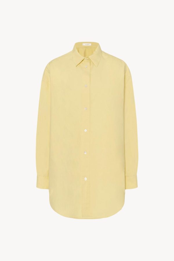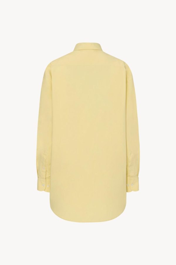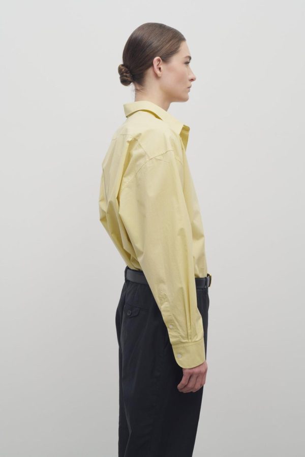 Classic button-up shirt in washed cotton poplin with curved hem, slim back yoke, and exposed front button placket.