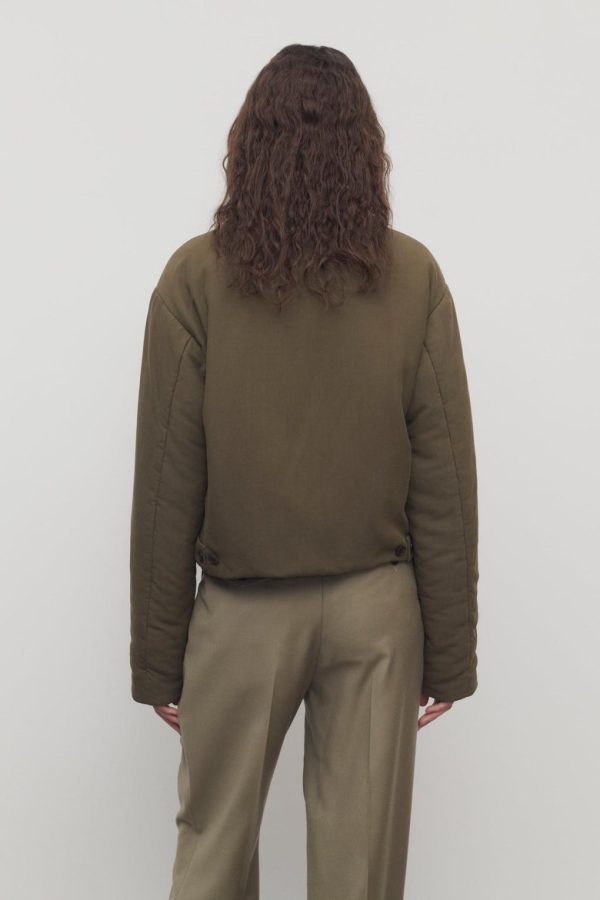 Boxy bomber jacket in fluid silk crepe with adjustable straps at side waist, slant welt pockets, and center front zip closure.