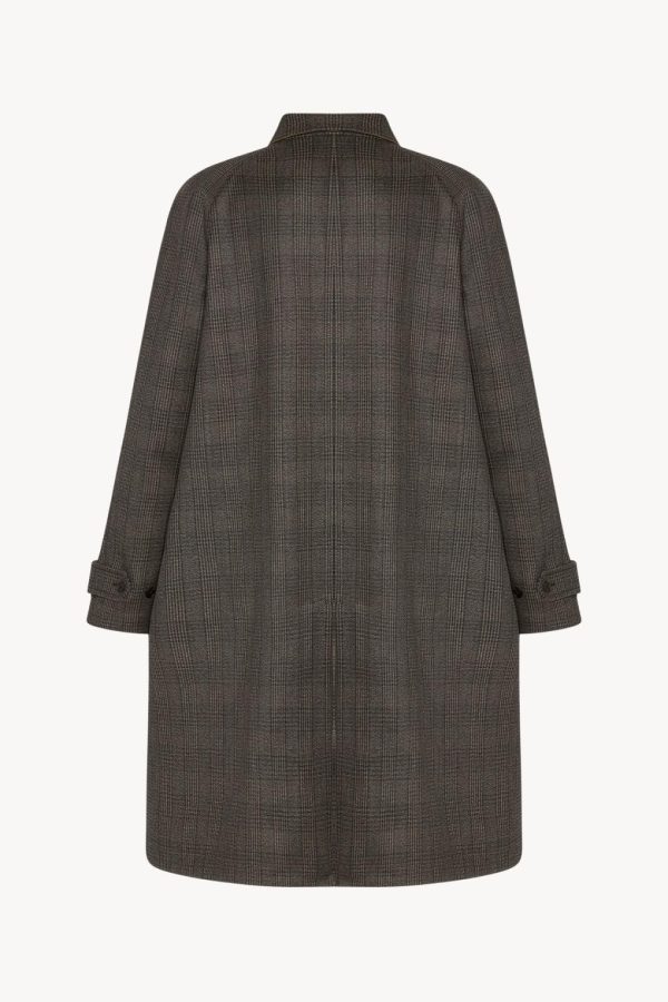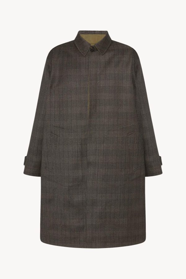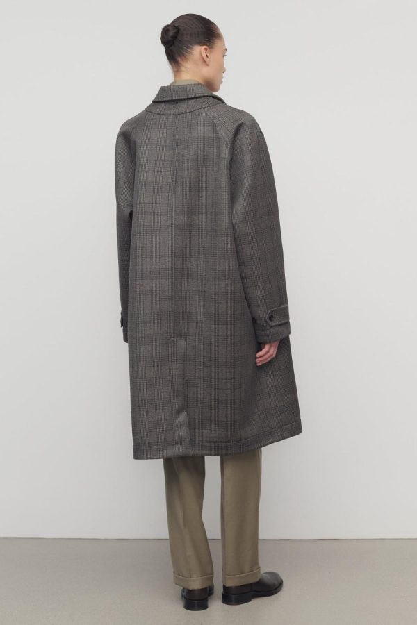 Reversible single-breasted car coat in glen check virgin wool and silk with raglan construction, patch and welt pockets, and concealed front placket with button closure.