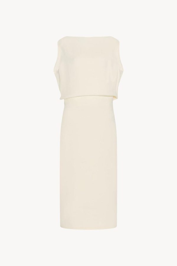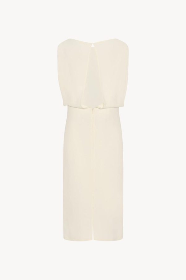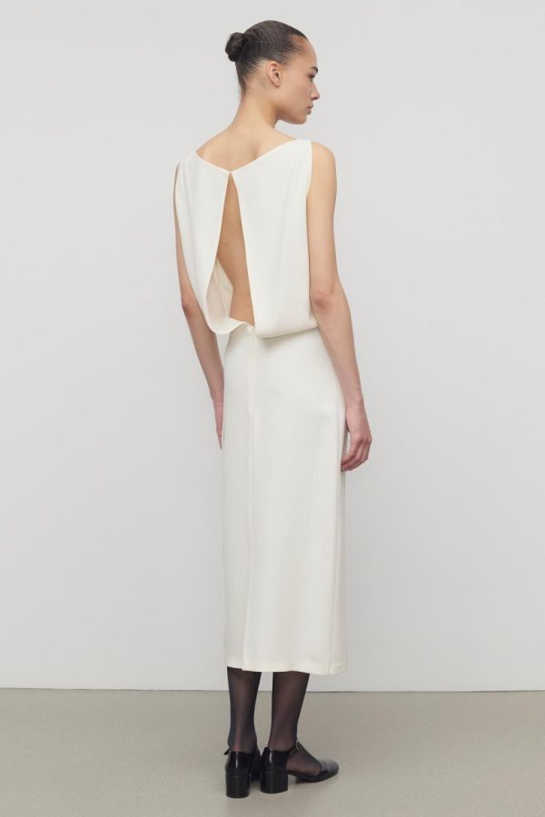 Calf-length column dress in smooth heavyweight silk with open back slit, center back hem vent, and concealed back zip closure with hook & eye at neckline.