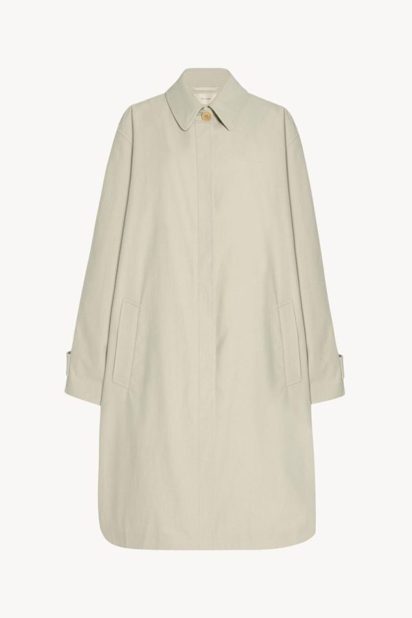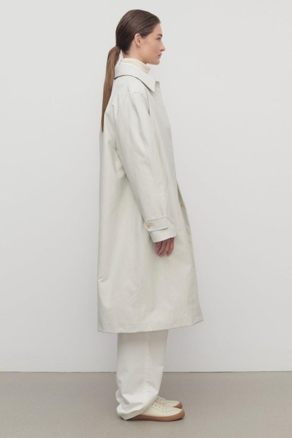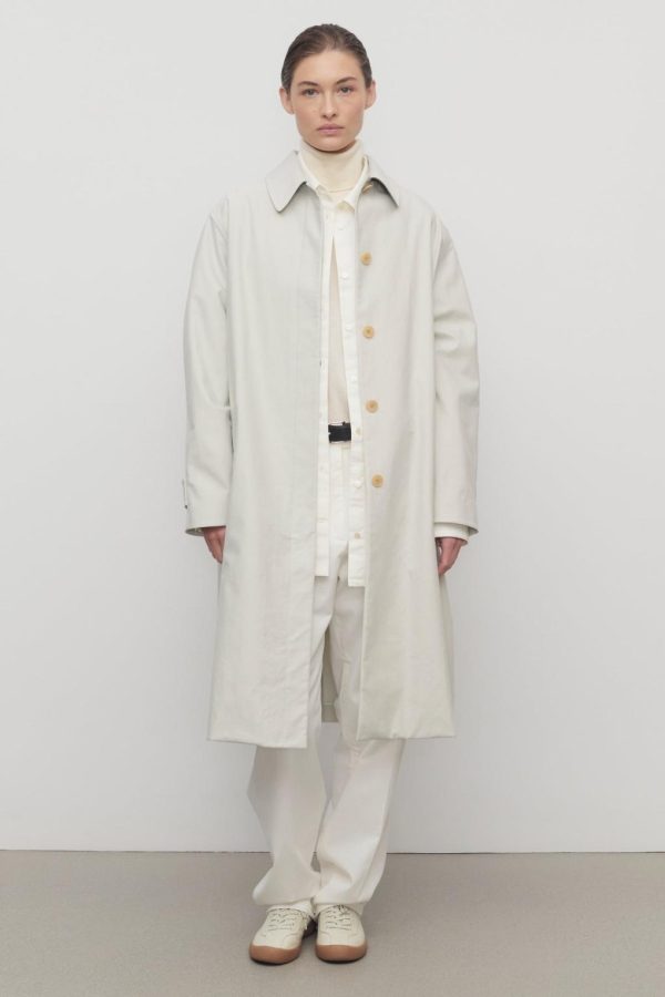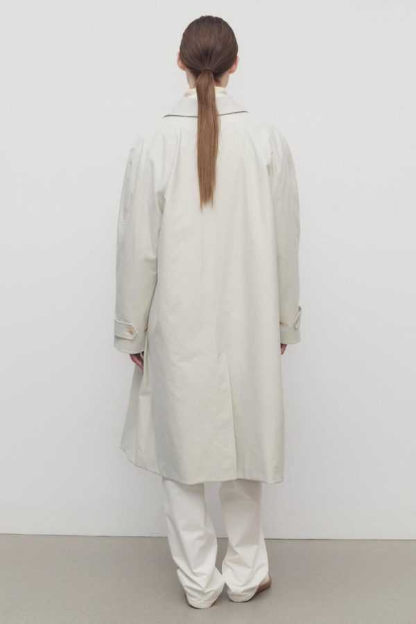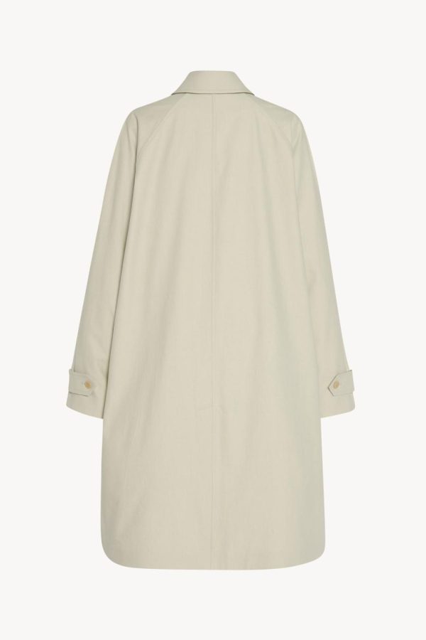 Relaxed single-breasted car coat in washed cotton and cashmere with raglan construction, slant welt pockets, and concealed front placket with button closure.