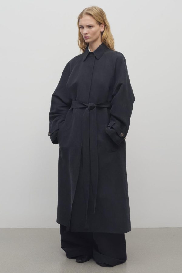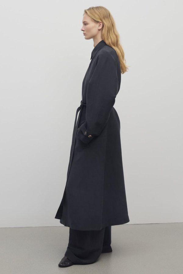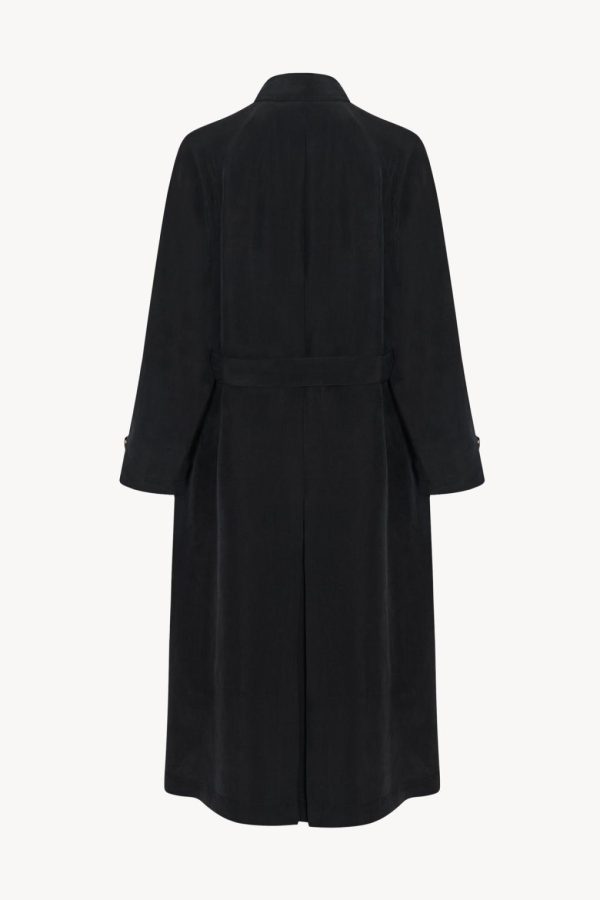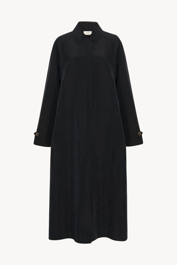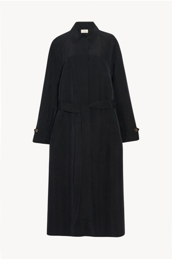Ankle-length trench coat in natural silk shantung with self belt, front welt pockets, and concealed front placket with horn button closure.