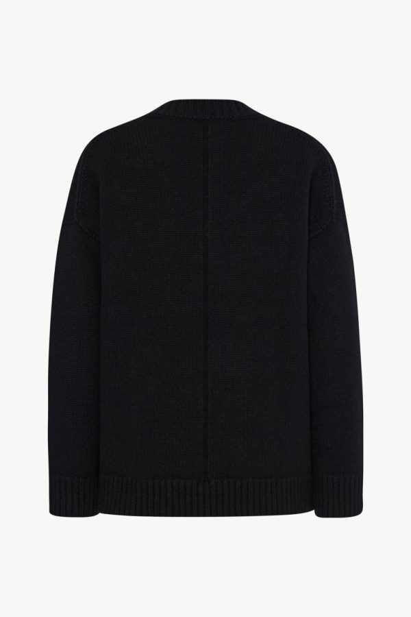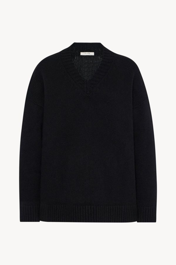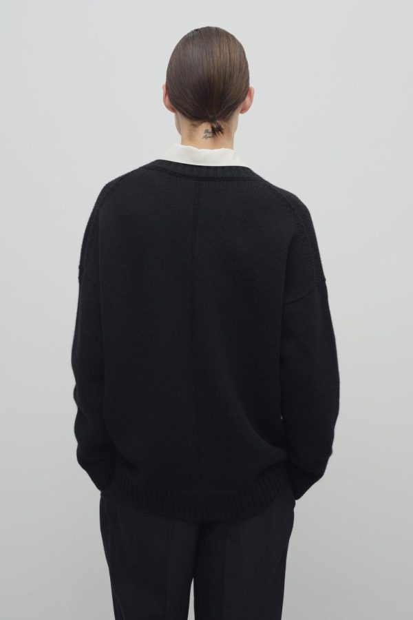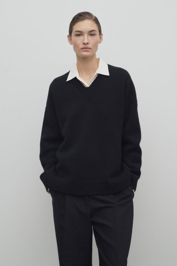 Relaxed v-neck sweater in warm wool and cashmere knit with dropped shoulders, ribbed neckline, cuffs, and hem, and signature center back detail.