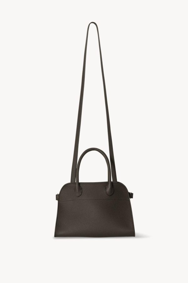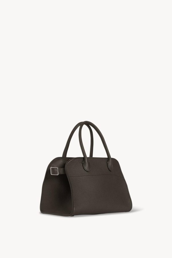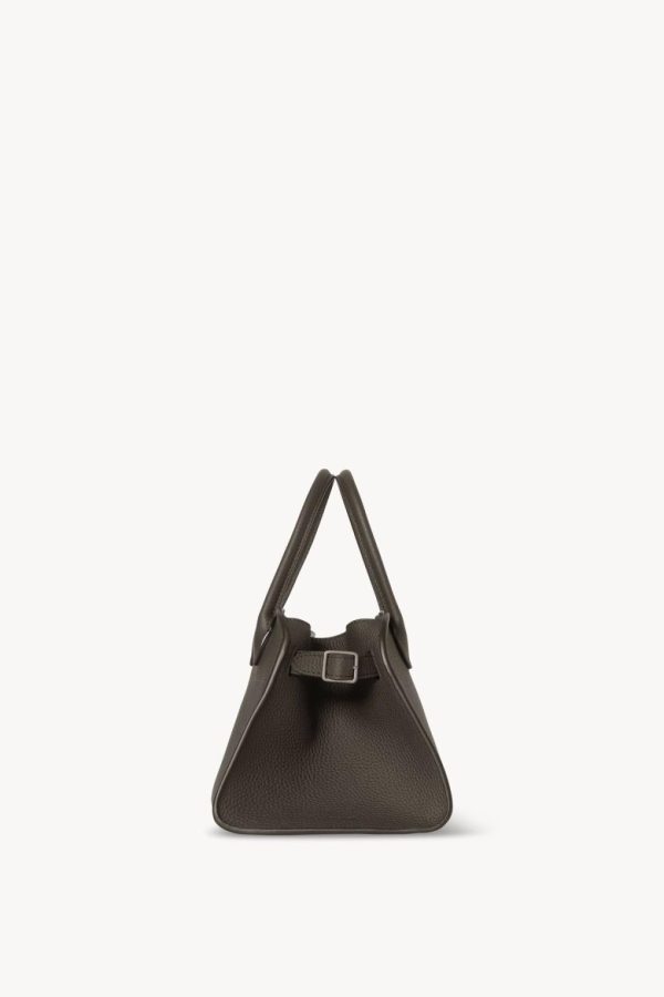 Softly structured top-handle bag in matte grained calfskin leather with belted gusseted side panels and interior toggle closure.