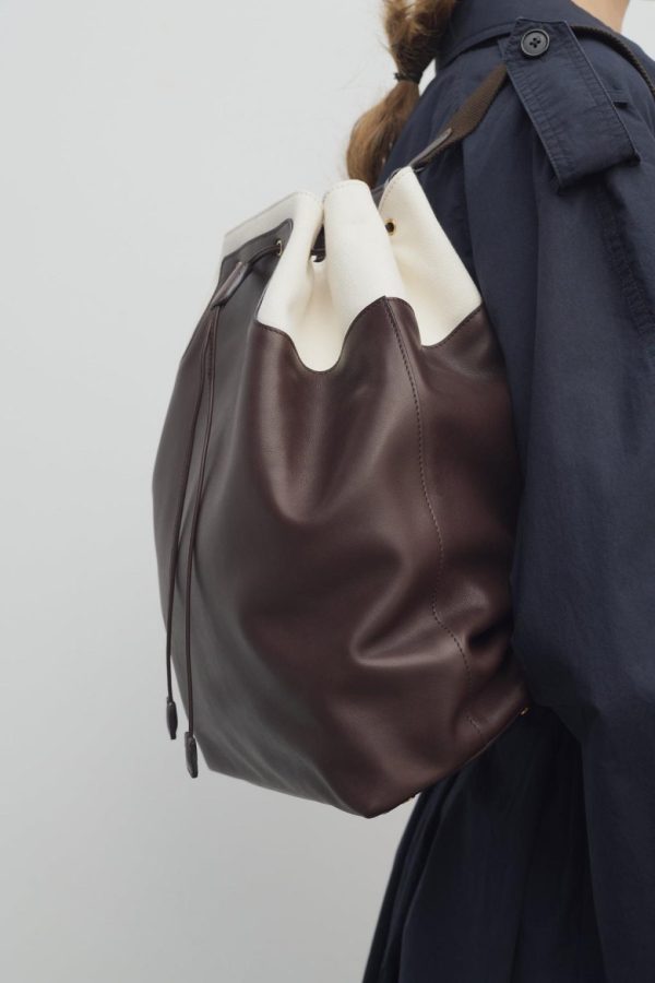 Softly structured backpack in smooth saddle leather with contrast canvas top panel, adjustable shoulder straps, and drawstring closure.