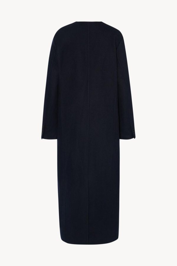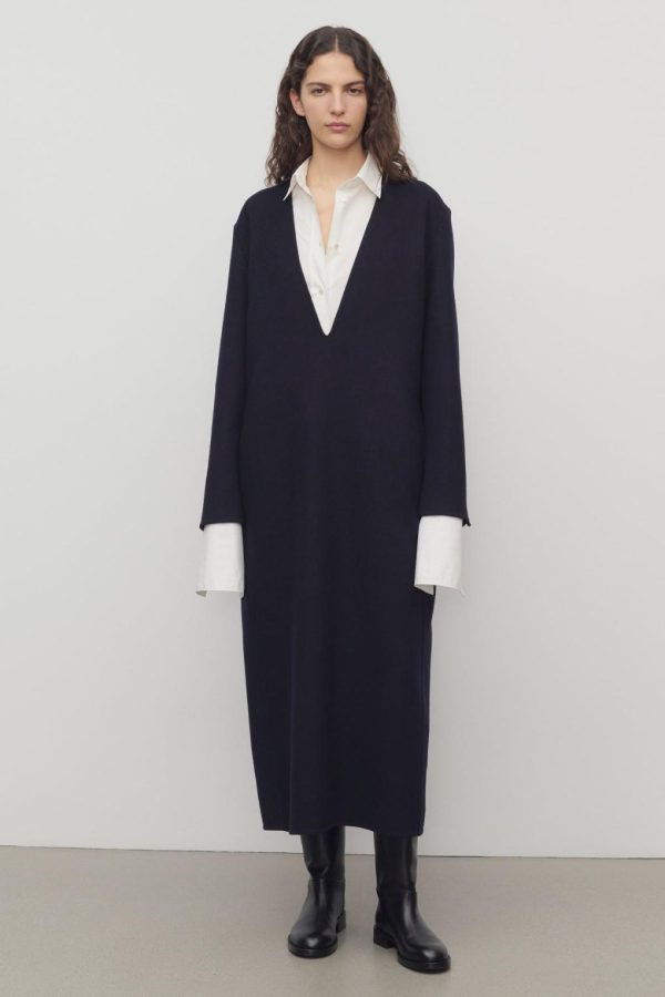Ankle-length dress in lightweight double-faced cashmere with slightly oversized fit, deep v-neckline, and side seam pockets.