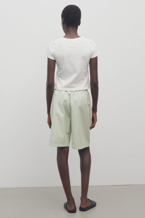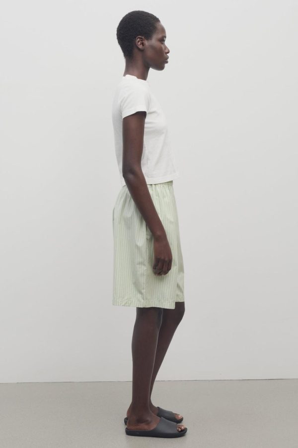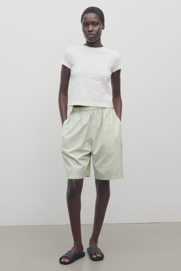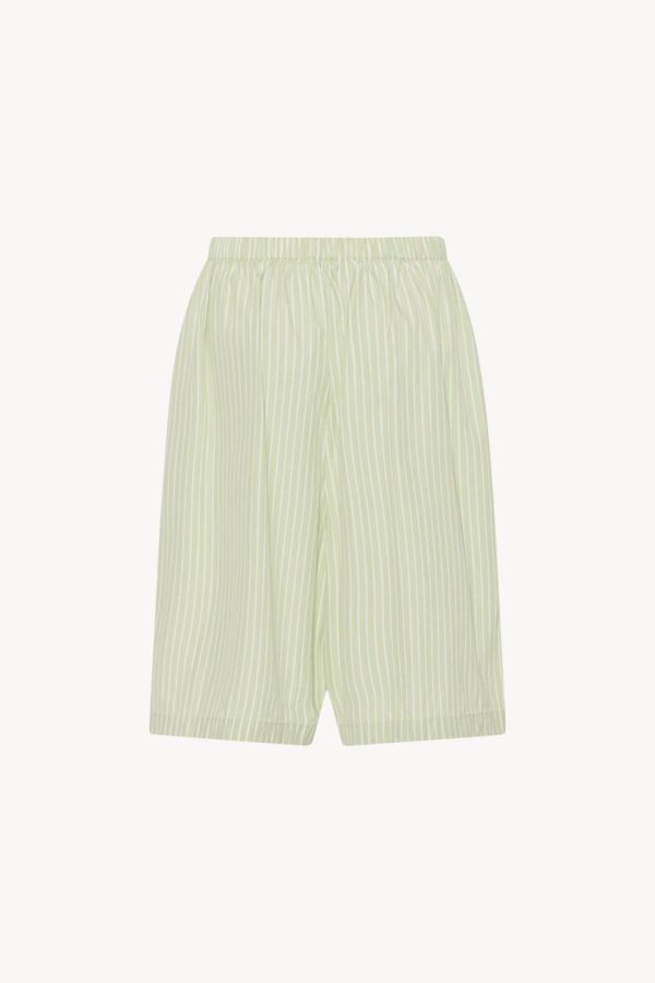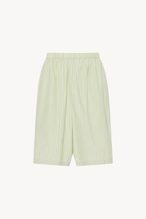 Mid-rise pajama short in Japanese cotton poplin with gathered elastic waistband, side seam pockets, and above-the knee length.